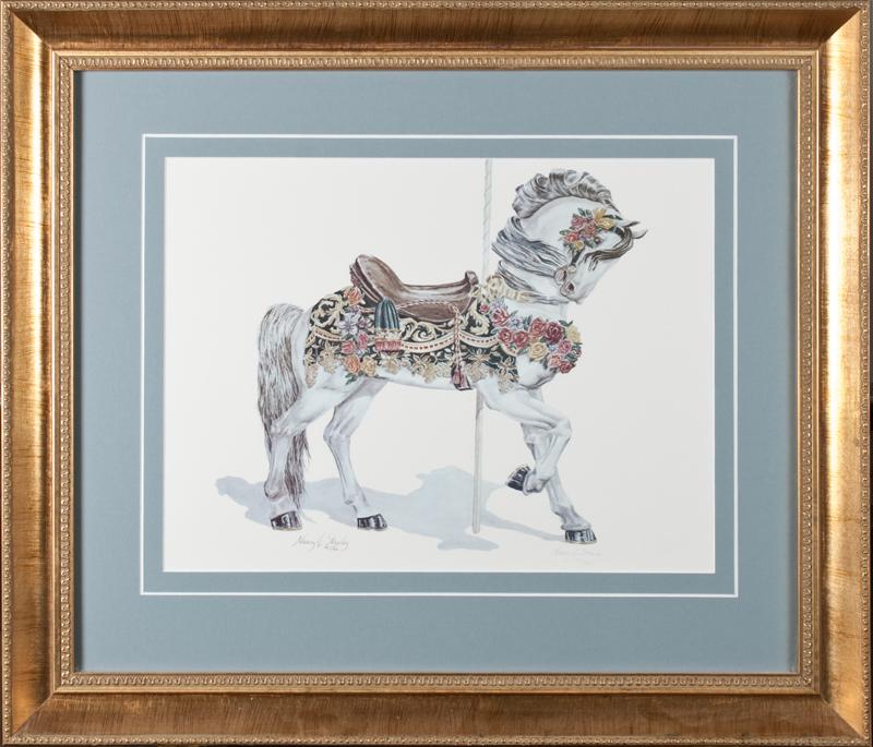 Depicting a carousel horse, pencil signed LR, #71/300, dated 1982, nicely framed and matted, 23.75" H x 27.75" W (including frame).
