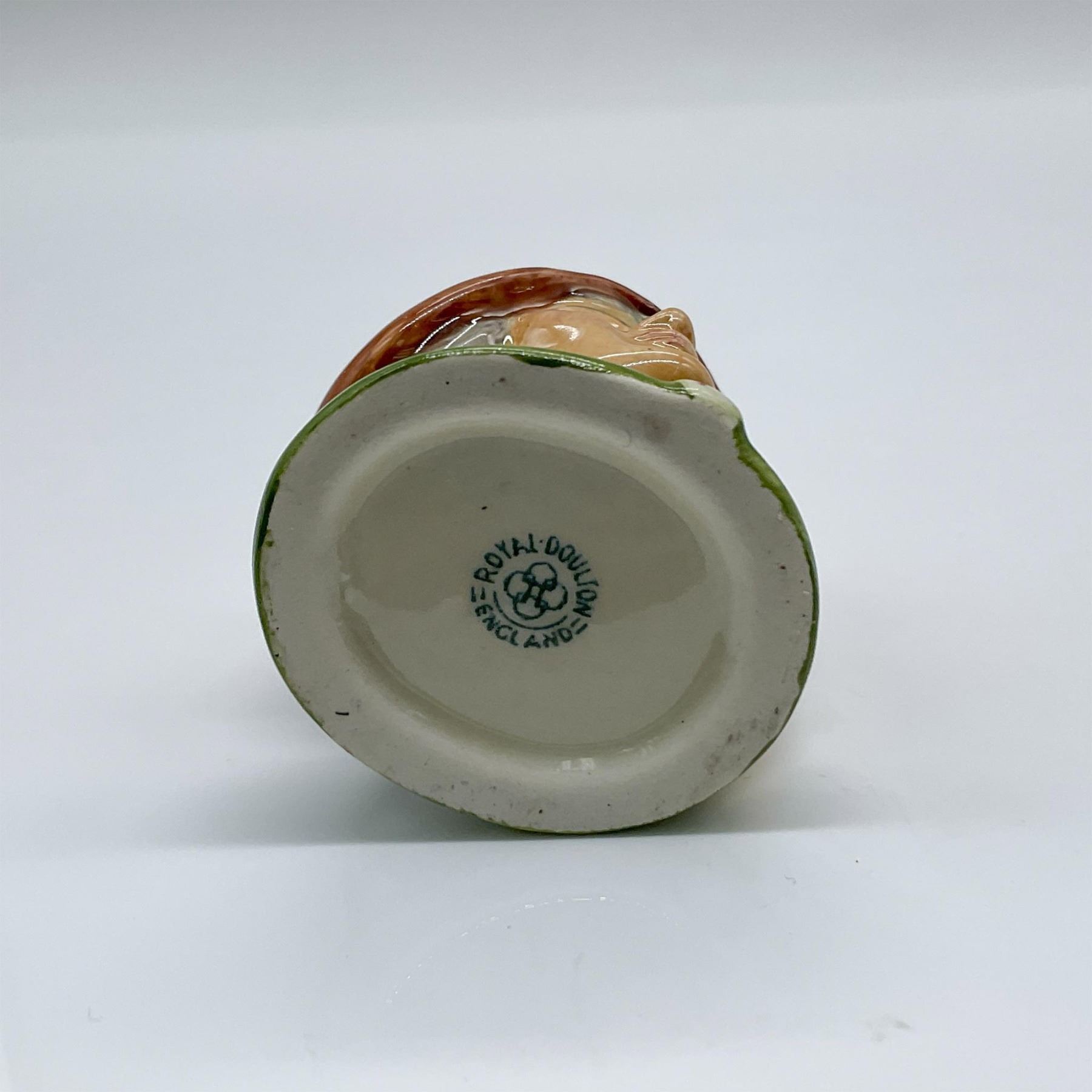 Proposed piece for the Oliver Twister Tinies Set. Hand painted prototype colorway of the Charles Dicken's Oliver Twist character, Nancy, who was part of Fagin's gang. Green shawl, white with red dot shawl clasp, gray hair, brown hat with yellow band and pink flowers. Yellow ribbon from the hat as the handle. Royal Doulton backstamp.