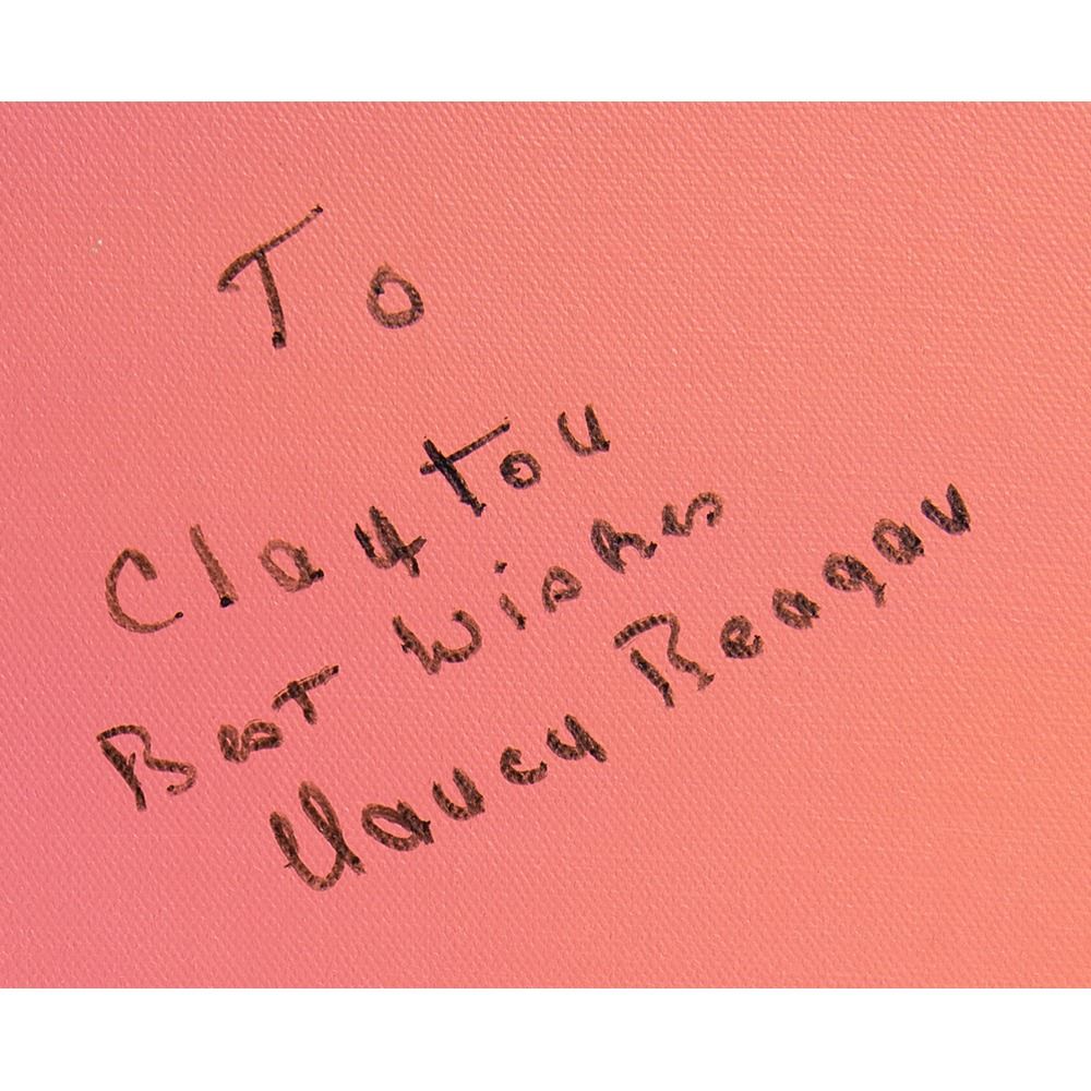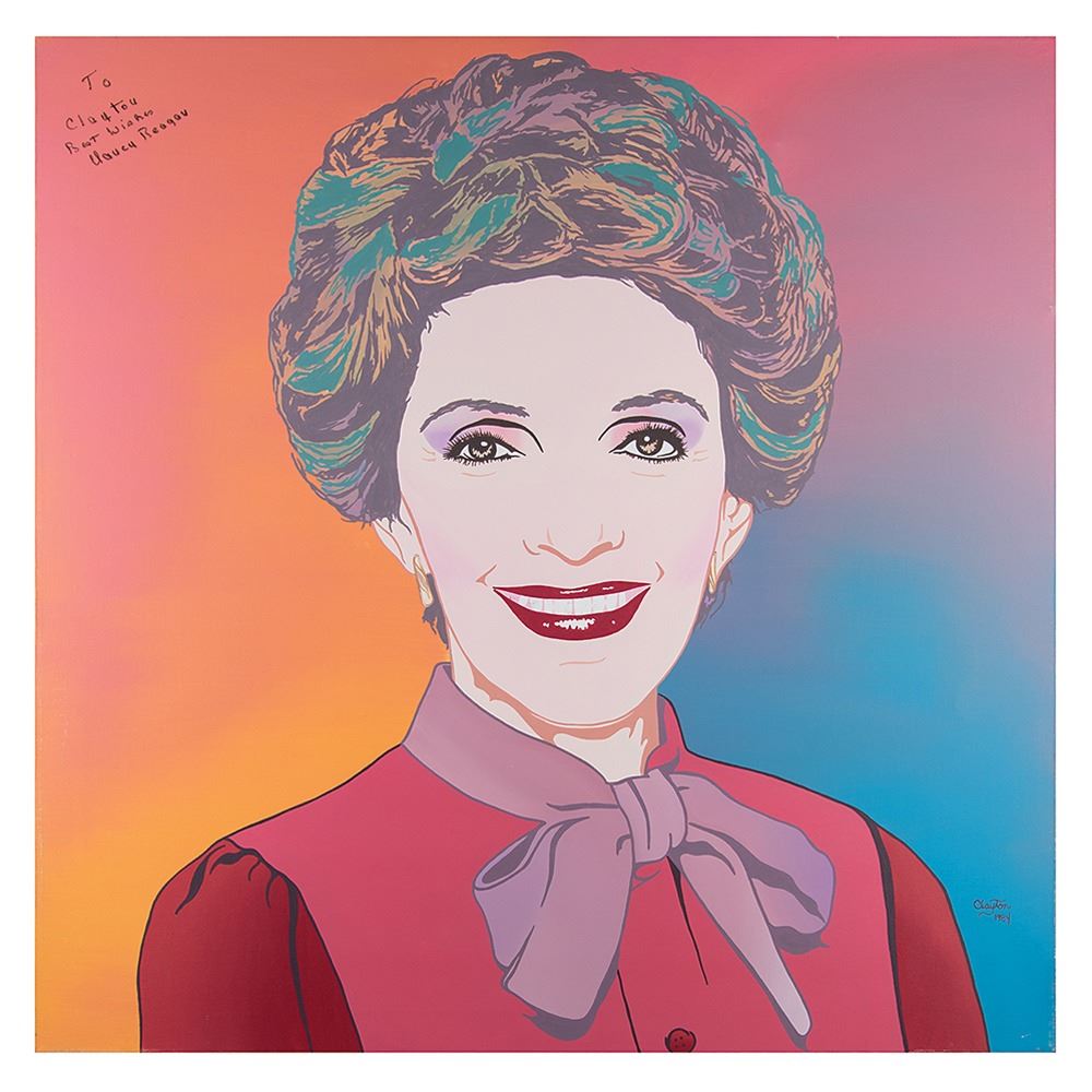 Huge pop art–style painting of Nancy Reagan accomplished in acrylic on stretched 36 x 36 canvas by artist Clayton Lefevre, signed and inscribed in the upper left corner in black felt tip, "To Clayton, Best wishes, Nancy Reagan." Also signed and dated in the lower right corner in black paint by the artist, "Clayton, 1984." In fine condition.