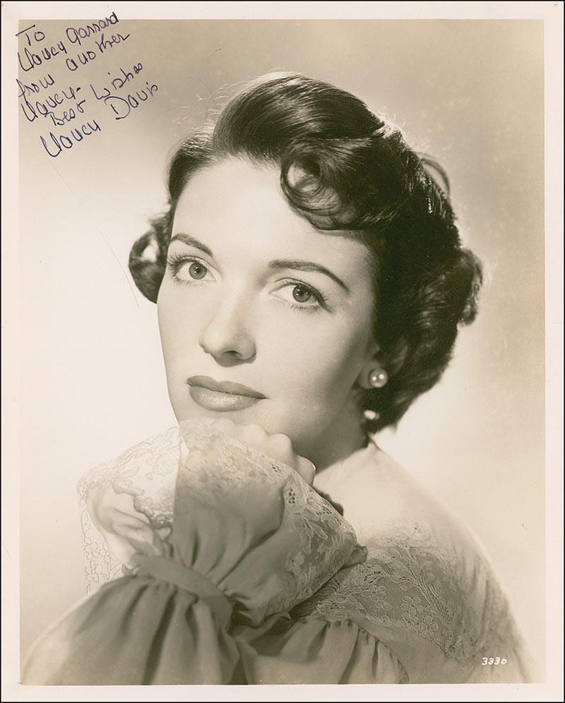 Vintage matte-finish 8 x 10 photo, signed and inscribed “To Nancy Garrard from another Nancy-Best wishes, Nancy Davis.” In fine condition, with some mild rippling along top edge.