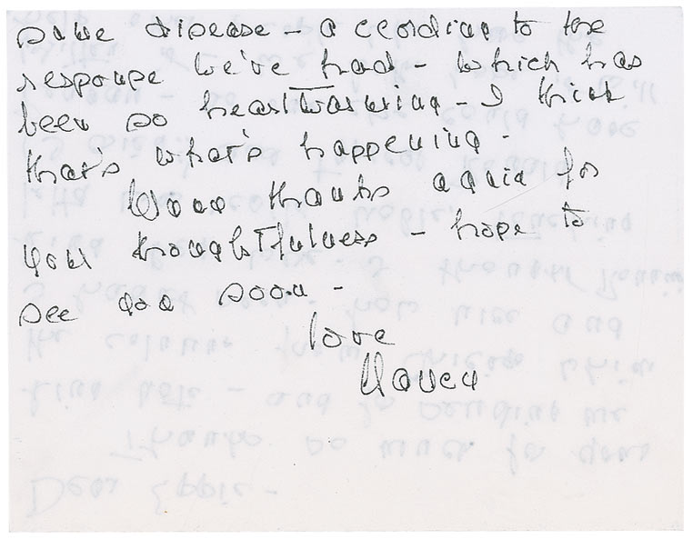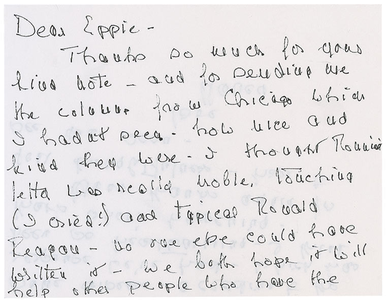 ALS signed “Nancy,” on both sides of her 5.75 x 4.5 personal notecard, no date, but postmarked November 15, 1994. Letter of thanks to her friend, Eppie Lederer (aka Ann Landers). In full: “Thanks so much for your kind note—and for sending me the column from Chicago which I hadn’t seen. How nice and kind they were. I thought Ronnie’s letter was really noble, touching (I cried!) and typical Ronald Reagan—no one else could have written it. We both hope it will help other people who have the same disease—according to the response we’ve had—which has been so heartwarming—I think that’s what’s happening. Many thanks again for your thoughtfulness—hope to see you soon.” In fine condition. Accompanied by the original mailing envelope, addressed in Reagan’s hand. Ten days earlier, her husband had informed the nation he had been diagnosed with Alzheimer’s Disease, closing his letter to the nation with the famous line “I now begin the journey that will lead me into the sunset of my life.” A rare and emotionally heartfelt glimpse at Nancy Reagan’s take on her husband’s groundbreaking admission.