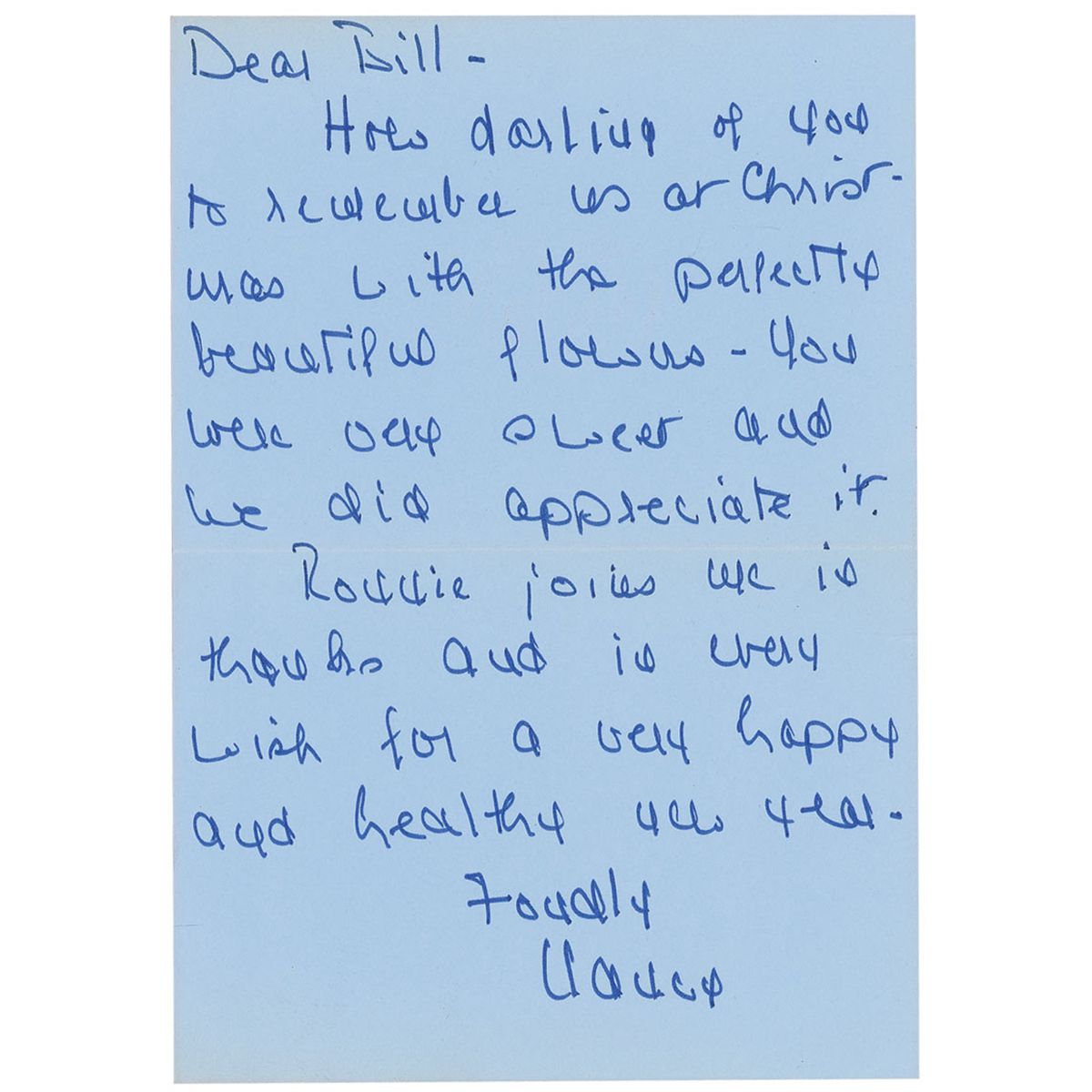 ALS signed “Nancy,” one page, 5.25 x 7.5, personal letterhead, no date. The First Lady sends thanks to a thoughtful friend, in full: “How darling of you to remember us at Christmas with the perfectly beautiful flowers—you were very sweet and we did appreciate it. Ronnie joins me in thanks and in every wish for a very happy and healthy new year.” In fine condition.