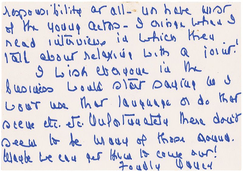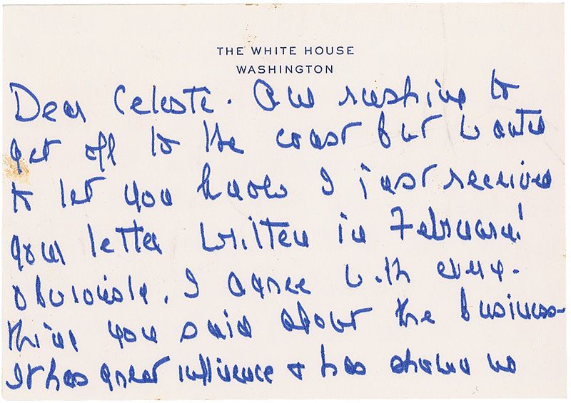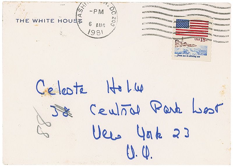 ALS signed “Nancy,” one page both sides, 5 x 3.25, White House letterhead, no date. Letter to Celeste Holm. In part: “I agree with everything you said about the business. It has great influence & has shown no responsibility at all—nor have most of the young actors. I cringe when I read interviews in which they talk about relaxing with a joint! I wish everyone in the business would start saying I won’t use that language or do that scene etc. etc. Unfortunately there doesn’t seem to be many of those around.” In fine condition. Accompanied by the original mailing envelope, addressed in Reagan’s hand.