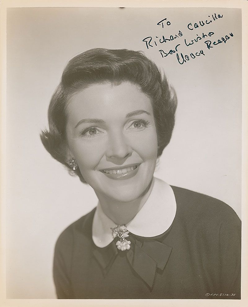 Glossy 8 x 10 photo of Reagan from her Hollywood days, signed and inscribed in black felt tip, “To Richard Cancilla, Best wishes, Nancy Reagan.” A few light creases and surface marks and some irregular emulsion to lower right, otherwise fine condition.