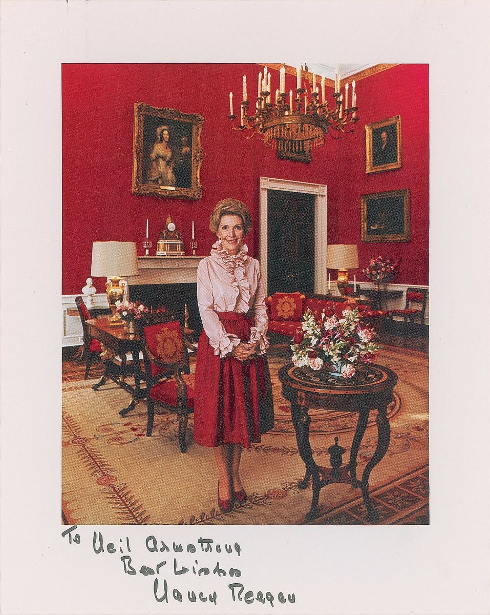 Lovely color semi-glossy 8 x 10 full-length photo of the first lady posing in the Red Room of the White House, signed and inscribed in the lower border in black felt tip, “To Neil Armstrong, Best Wishes, Nancy Reagan.” In fine condition.