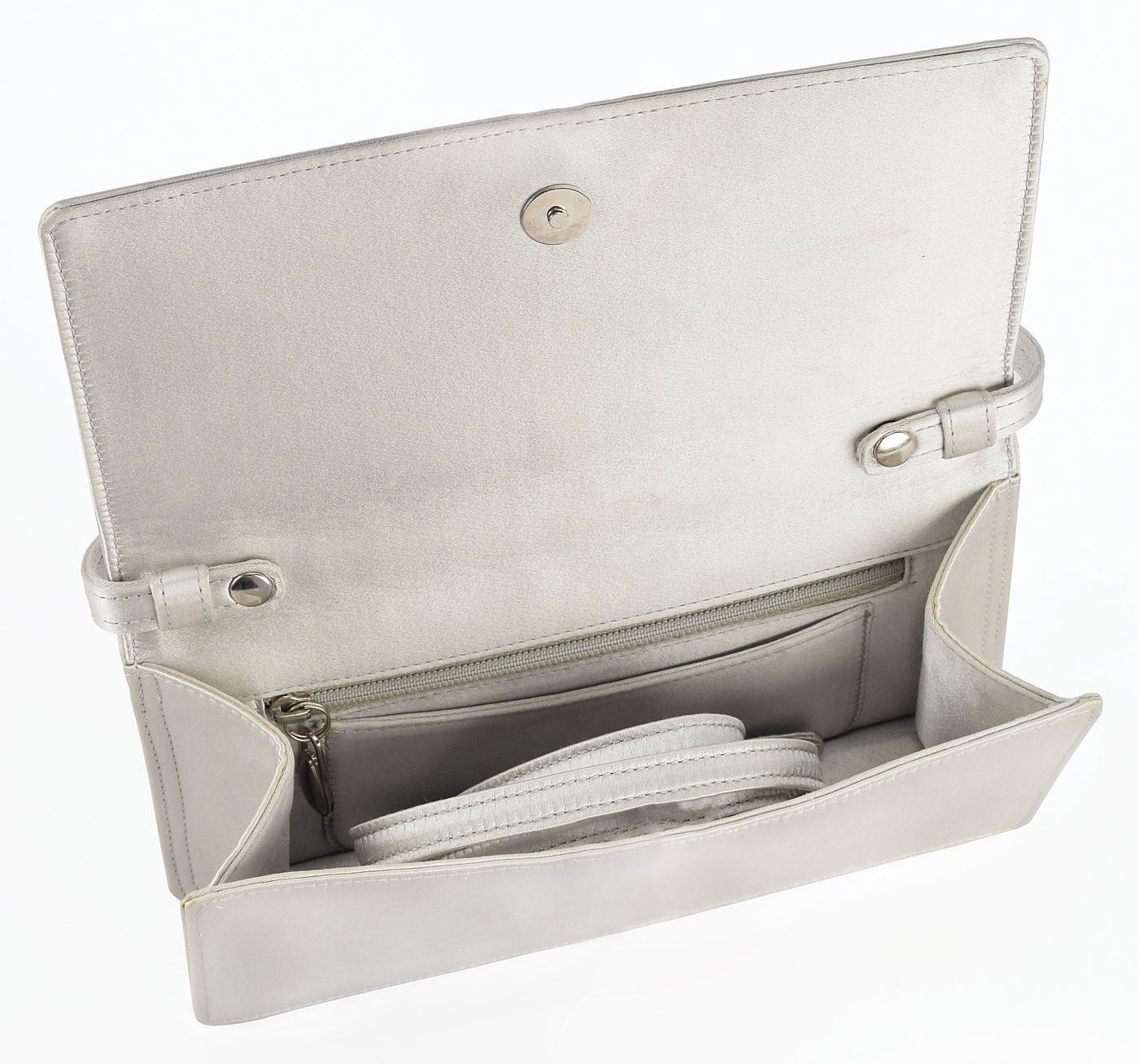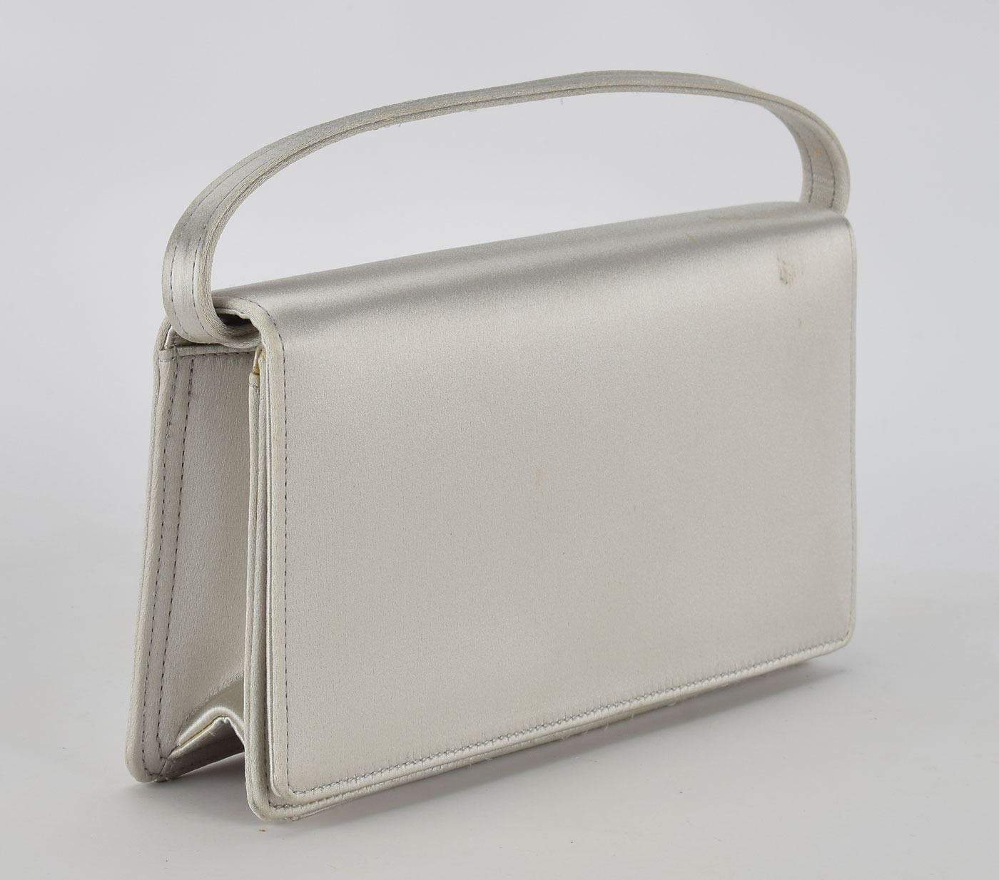 Nancy Reagan's personally-owned silver satin purse, featuring a small zippered interior pocket, strap extension, and rectangular flap with magnetic closure. In fine condition. Provenance: The Private Collection, President & Mrs. Ronald Reagan, Christie's, September 2016. Accompanied by the Christie's auction tag. Petite and almost always impeccably dressed, Nancy Reagan was well known for her interest in designer classics and her elegant sense of style. Although criticized in 1981 for wearing designer outfits during a recession, the first lady recalled in her memoir My Turn: 'If I had suddenly started dressing differently, how would that have helped the economy? On the contrary: I was told that because so many women look to the first lady as a fashion leader, I provided a great boost for fashion designers.'