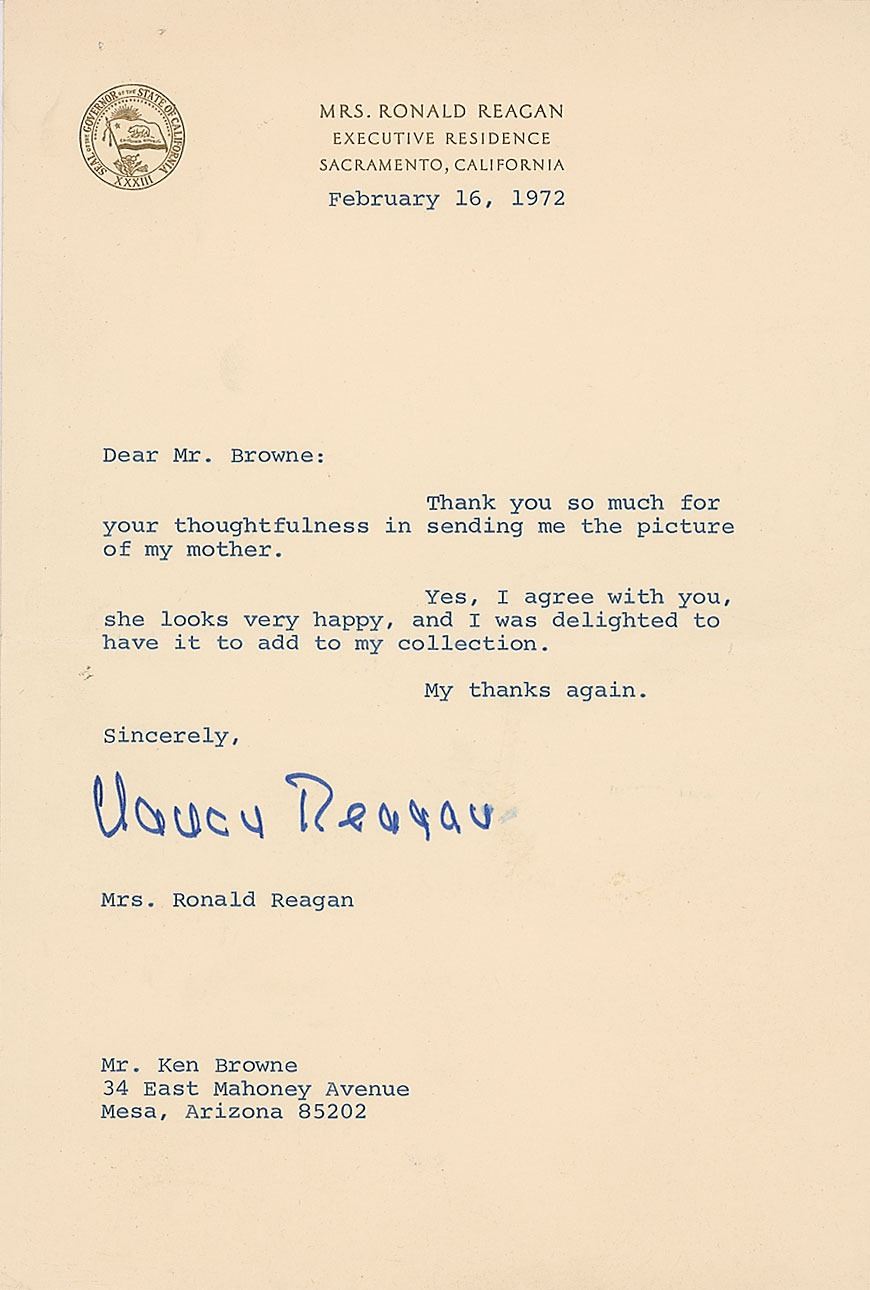 Two letters: an ALS, one page, 4.75 x 6.5, no date but postmarked June 16, 1966, in full: "Thank you so much for sending us the picture and article from the Arizona Republic. It helps me with my scrapbook-keeping! Wasn't the election wonderful? We haven't hit earth yet!"; and a TLS, one page, 6.25 x 9.25, personal letterhead, February 16, 1972, in part: "Thank you so much for your thoughtfulness in sending me the picture of my mother. Yes, I agree with you, she looks very happy, and I was delighted to have it to add to my collection." In overall fine condition, with staple holes to the upper left corner of the typed letter. Accompanied by both original mailing envelopes.