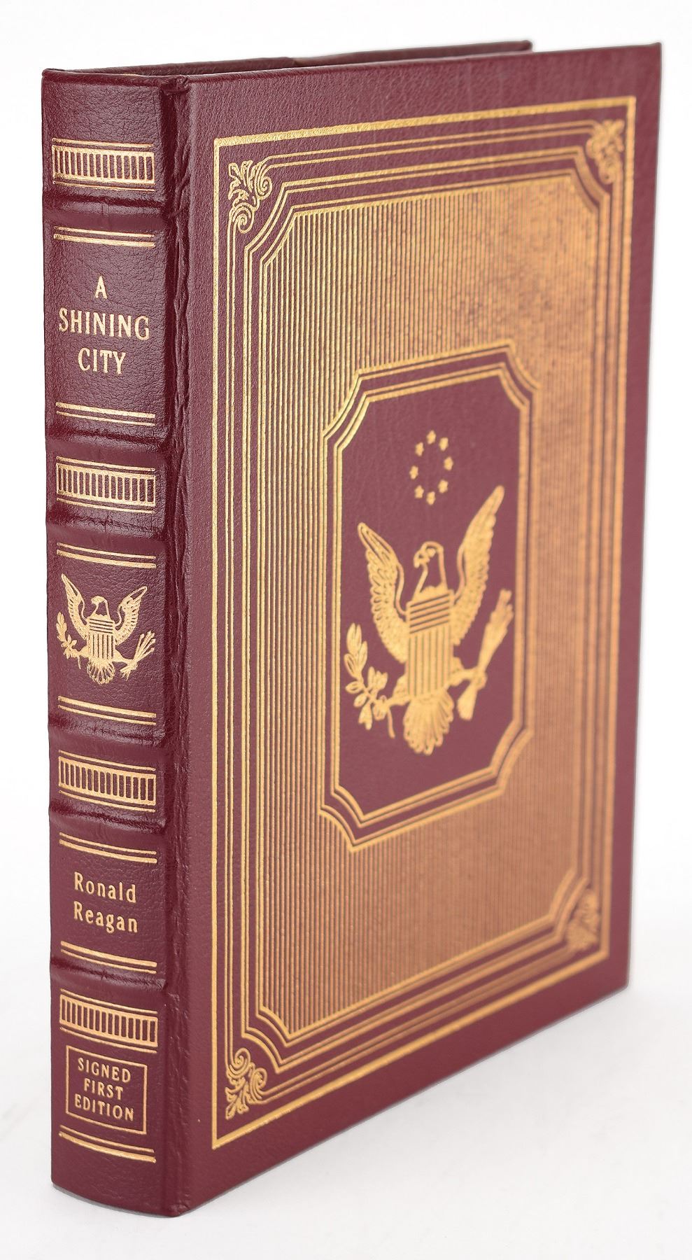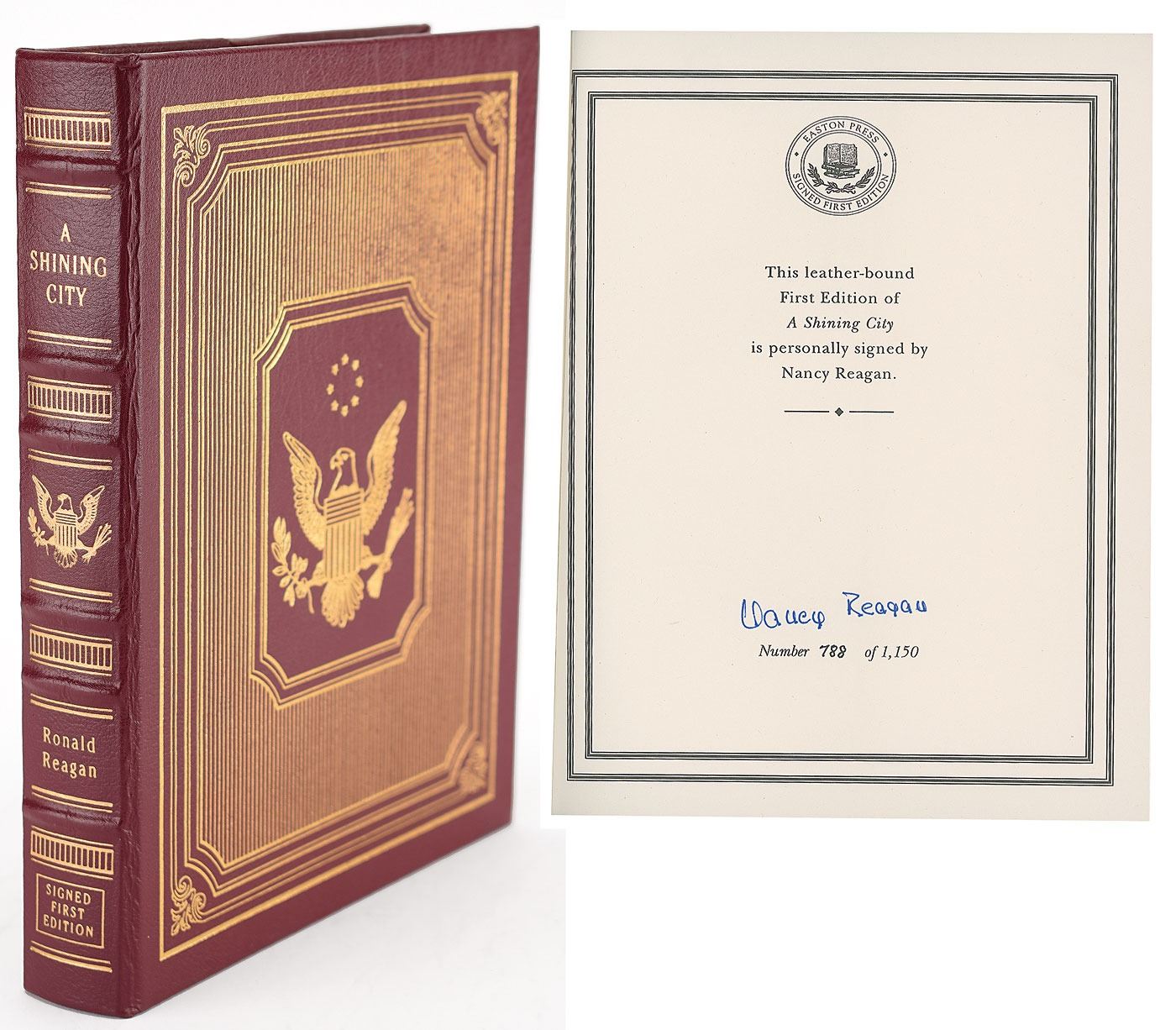 Signed book: A Shining City. Limited first edition, numbered 788/1150. Norwalk, CT: The Easton Press, 1998. Leatherbound hardcover, 7.5 x 9.5, 251 pages. Signed on the colophon in blue ink by Nancy Reagan. In very fine condition.
