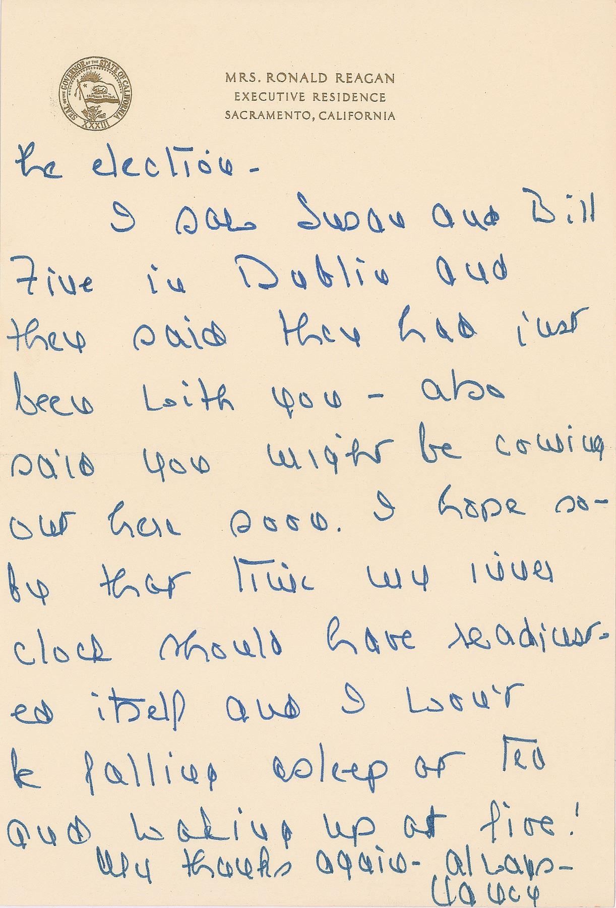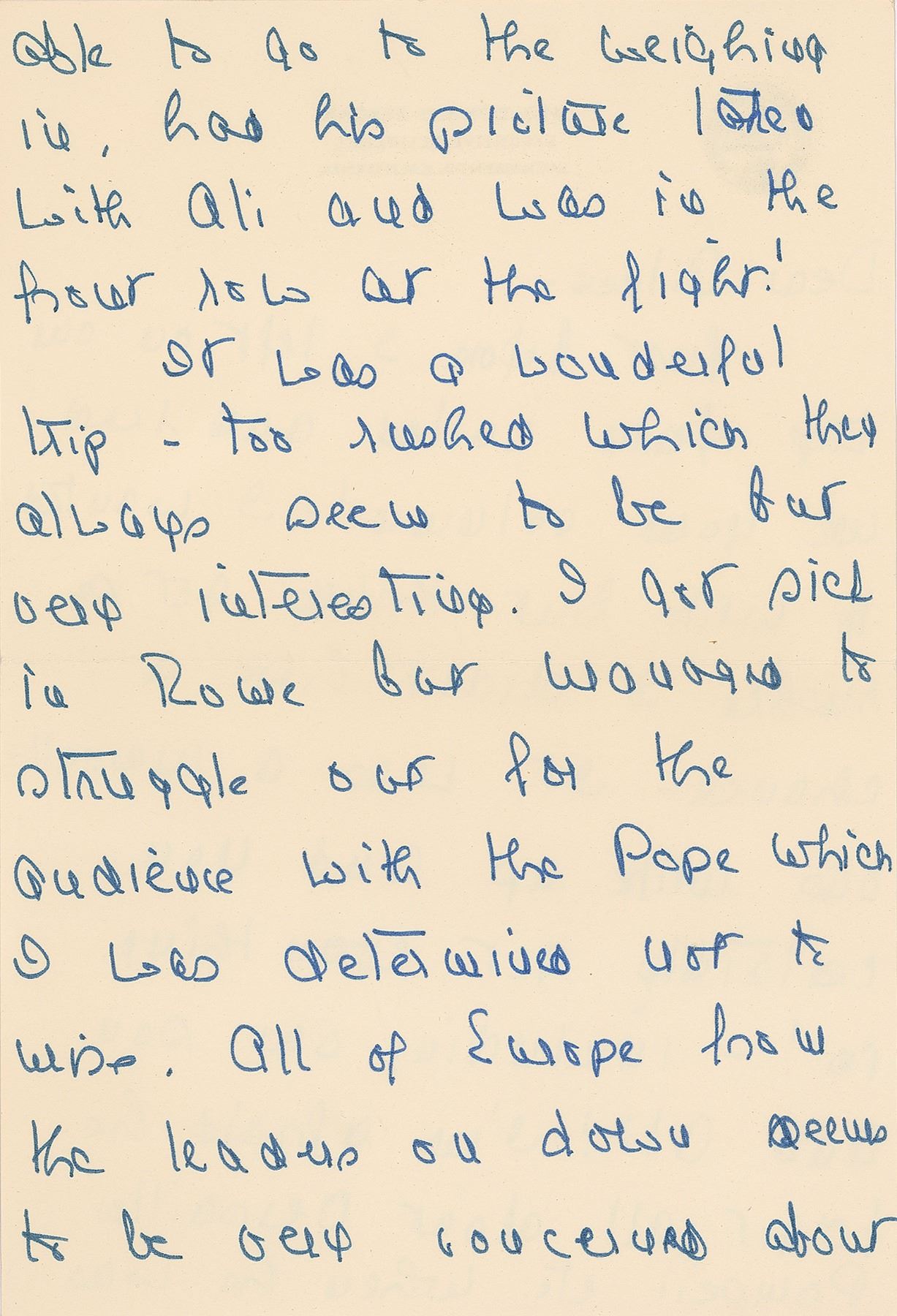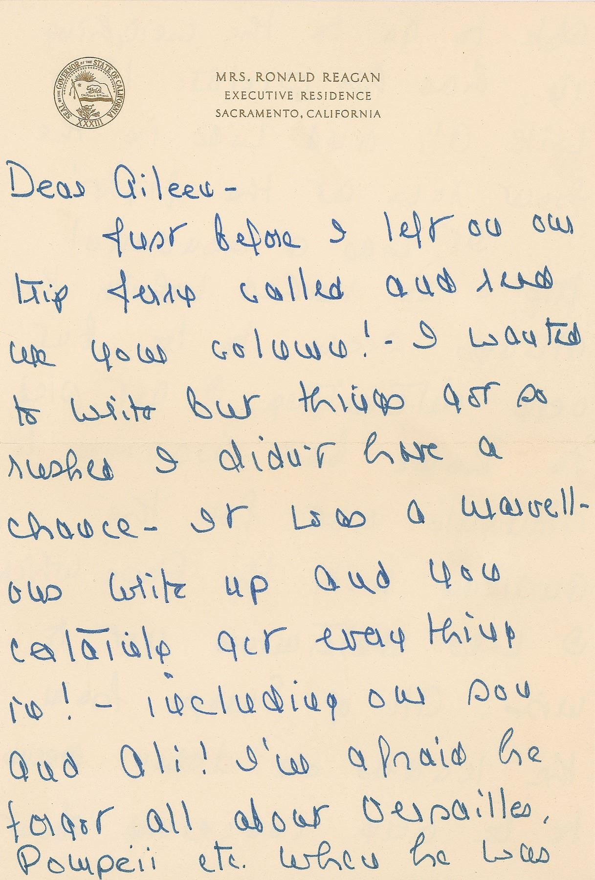 ALS signed “Nancy,” three pages, 6.25 x 9.25, personal Executive Mansion letterhead, July 28, 1972. Letter to columnist Aileen Mehle, in part: "Just before I left on our trip Jerry called and read me your column! I wanted to write but things get so rushed I didn't have a chance. It was a marvelous write up and you certainly get everything in!—including our son and Ali! I'm afraid he forgot all about Versailles, Pompeii etc. when he was able to go to the weighing in, had his picture taken with Ali and was in the first row at the fight! It was a wonderful trip—too rushed which they always seem to be but very interesting. I got sick in Rome but managed to struggle out for the audience with the Pope which I was determined not to miss." In fine condition. Accompanied by the original mailing envelope, addressed in Reagan's own hand.