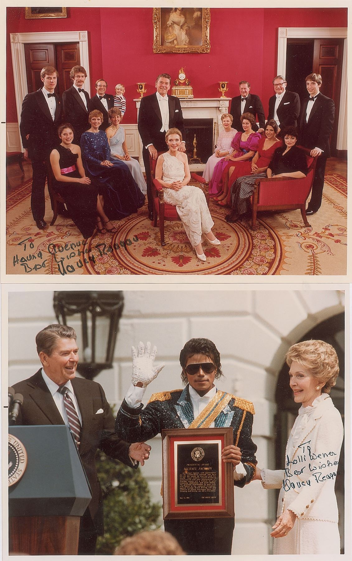 Two color satin-finish 10 x 8 photos: one of Nancy and Ronald Reagan presenting Michael Jackson with the Presidential Public Safety Communication Award for allowing the song 'Beat It' to be used in a public service campaign against teen drinking and driving, signed and inscribed in black felt tip, "To Lolli Wener, Best wishes, Nancy Reagan”; and one of the Reagan family posing in the red room at the White House for Reagan's inauguration in 1981, signed and inscribed in black felt tip, "To Henry Avenue, Best wishes, Nancy Reagan." In overall very good to fine condition, with two light creases passing across the image with Jackson, and another light vertical crease just touching the top of Nancy's hair.