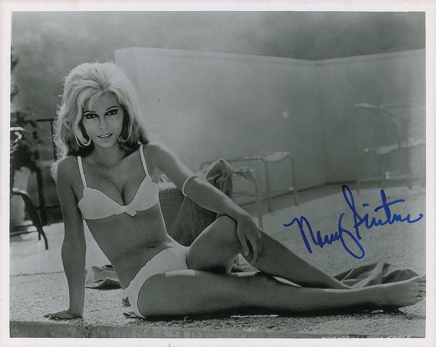 Glossy 10 x 8 photo of Nancy Sinatra lounging in a white swimsuit, signed in blue felt tip. In fine condition, with a small spot of emulsion irregularity to the background.