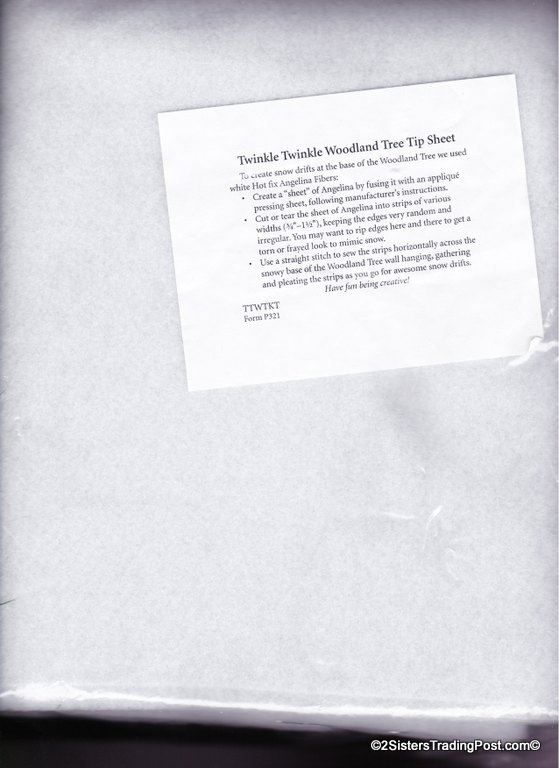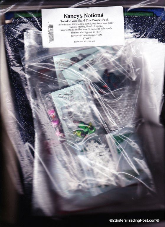 Twinkle Twinkle Woodland Tree' wall hanging kit #TTWTKT includes 4 fabrics, one tissue lame fabric, batting, backing, Hot-fix Angelina, assorted trims and buttons, O-rings, and hole punch. This kit is to be used with Twinkle Twinkle Little Tree Pattern TBTTLT (NOT INCLUDED) available at www.nancysnotions.com finished wall hanging is approx. 27" x 33" MSRP $59.00