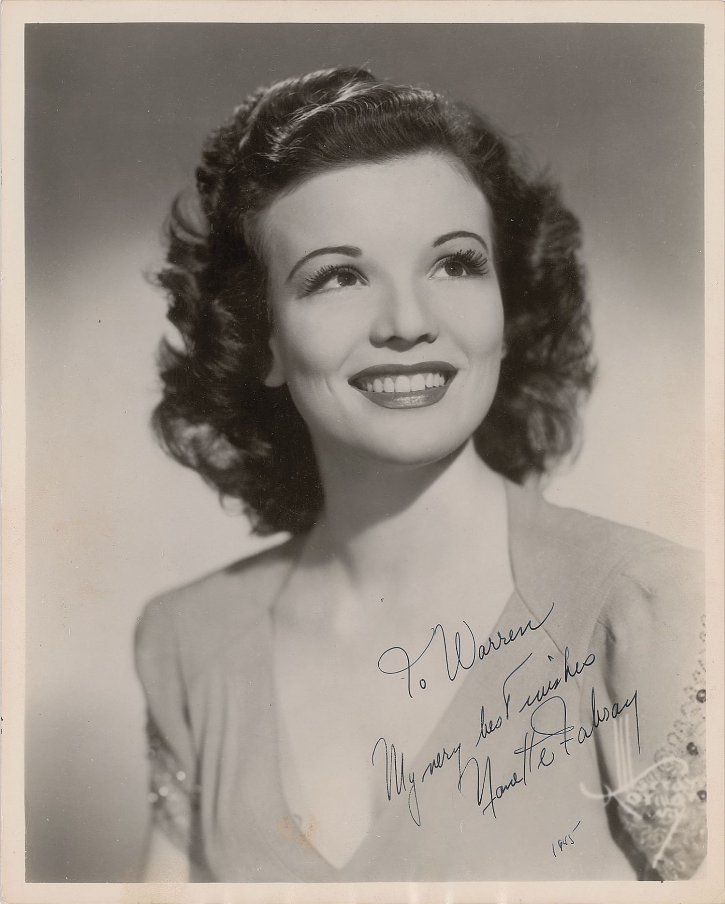 American actress, dancer and singer (born 1920) who won a Tony Award in 1949 for her performance in Love Life, and in the mid-1950s she won three Emmy Awards as Sid Caesar's comedic partner on Caesar's Hour. Fabray has been a longtime advocate for the rights of the deaf and hard of hearing, and has been honored with the President's Distinguished Service Award and the Eleanor Roosevelt Humanitarian Award. Appealing vintage semi-glossy 8 x 10 studio portrait of Fabray by Murray Korman of New York, signed and inscribed in fountain pen, "To Warren, My very best wishes, Nanette Fabray, 1945.” In fine condition.