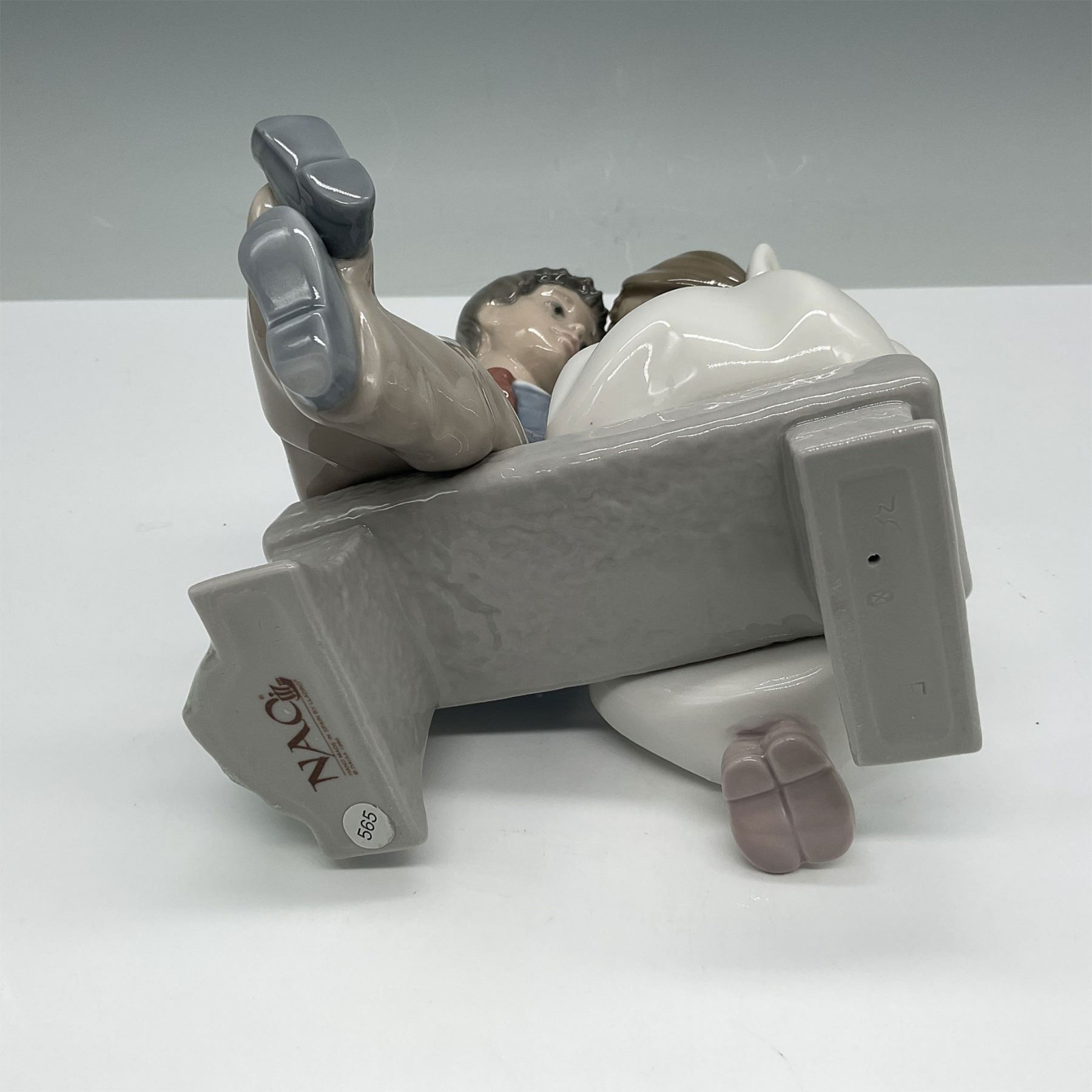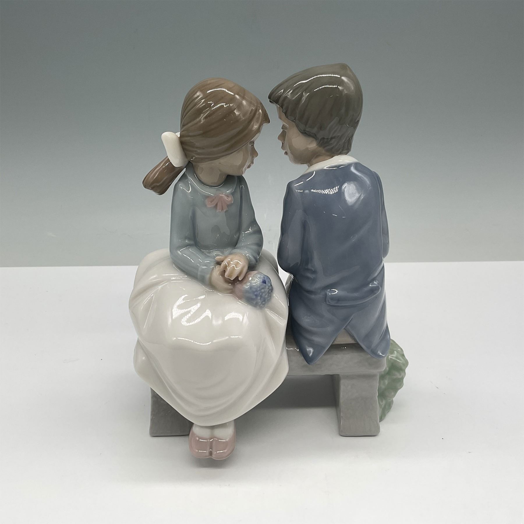 Charming porcelain figurine by Nao, a division of Lladro, depicting a young girl seated gracefully on a rock with a delicate bird perched nearby. The girl wears a wide-brimmed white hat with a ribbon and a flowing blue skirt, evoking a serene and pastoral aesthetic. Made in Spain and marked on the base, this piece reflects the craftsmanship synonymous with Lladro.