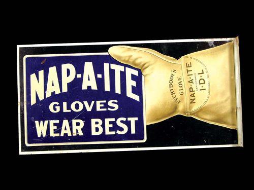 Nap-a-lite Gloves Tin Flange Sign. Both sides have minor surface scratches otherwise good overall condition. 18 1/2 X 9 1/4 inches.