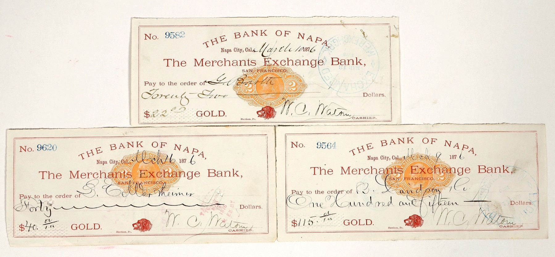 Lot of 3 checks on Bank of Napa with RN-F, 1876. To be paid in Gold. Rare.