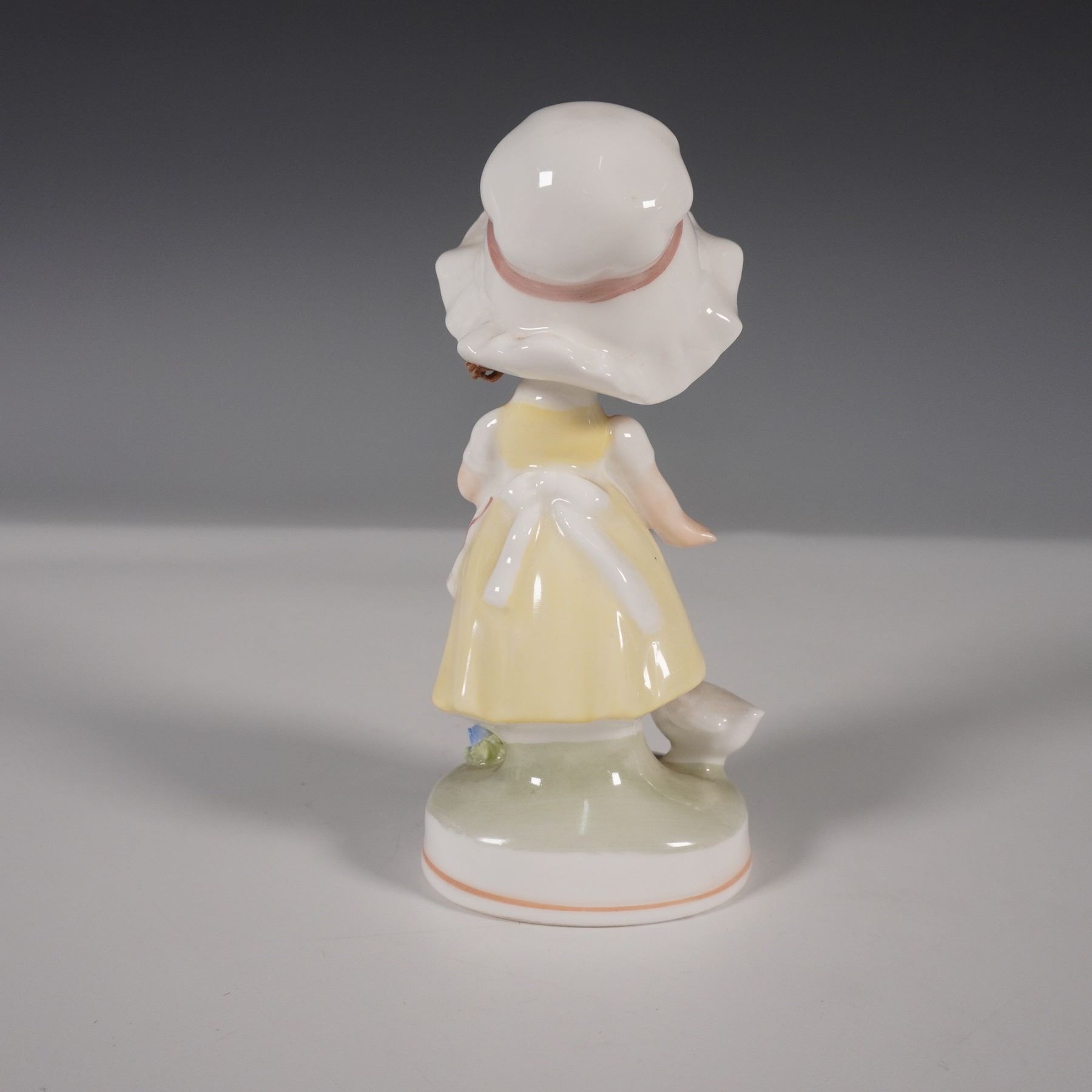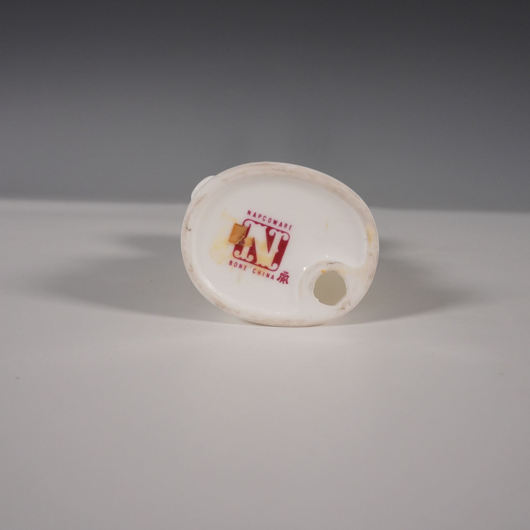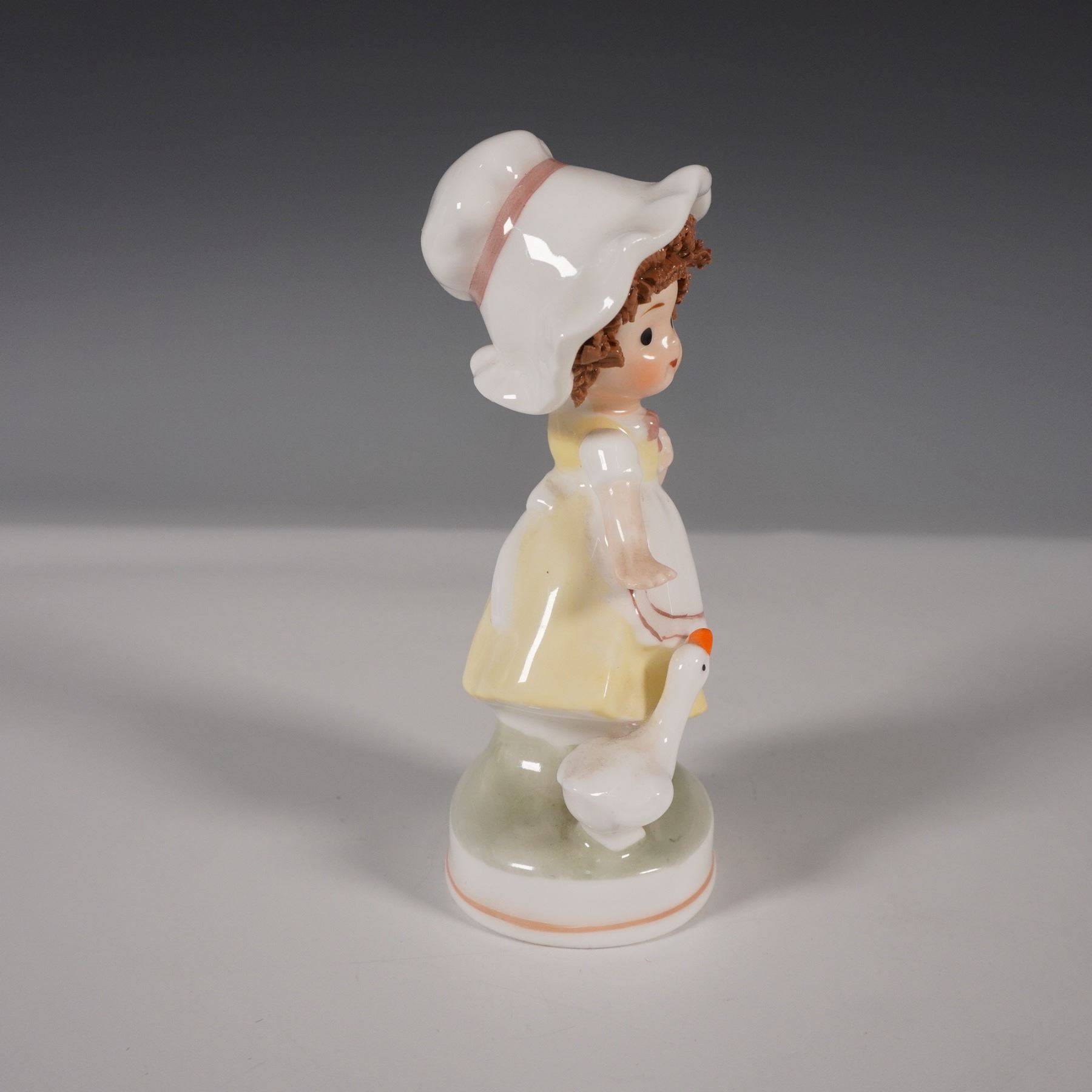 A vintage Napco Ware bone china figurine featuring a young girl in a yellow dress with a white apron and a wide-brimmed hat, playfully interacting with a white goose. The figurine is finely detailed, with textured brown curls and hand-painted accents, exuding a charming and nostalgic appeal. Marked on the base with the Napco Ware logo in red.