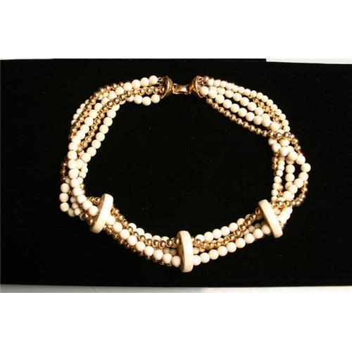 Napier design, three strands of round cream lucite beads with faint gray lines with two strands of round grooved brass beads run through three circular cream lucite discs, dome shaped goldtone end caps, snap clasp. Length: 18", Width: approx. 1 1/4".