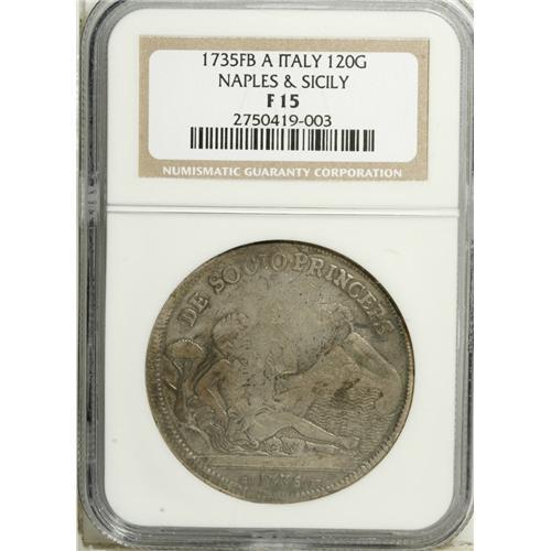 <B>Naples & Sicily. Early Silver Types, </B></I>Charles II Tari 26 Grana 1684, VF20 NGC, toned with one lighter area, and Carlo III 120 Grana 1735-FBA-GH, Fine 15 NGC, toned with some tiny surface marks on the reverse. <B>Sold as is, no return lot.</B></I><BR><BR><b>Shipping:</b> Coin/Currency (<a target="_blank" href="http://www.heritageauctions.com/common/shipping.php">view shipping information</a>)
