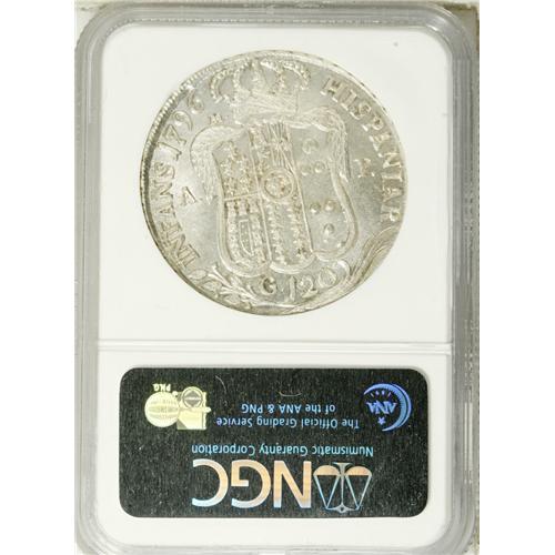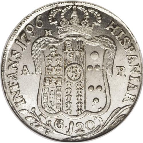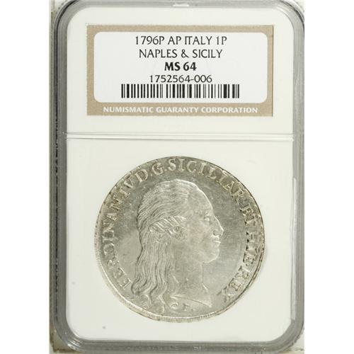 <B>Naples & Sicily. Ferdinand IV 120 Grana/Piastra 1796P-AP, </B></I>KM-C66b, Davenport 1409, MS64 NGC, full frosty white luster with a particularly choice reverse. Very desirable quality for this series.<BR><BR><b>Shipping:</b> Coin/Currency (<a target="_blank" href="http://www.heritageauctions.com/common/shipping.php">view shipping information</a>)