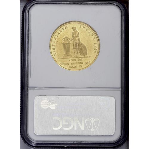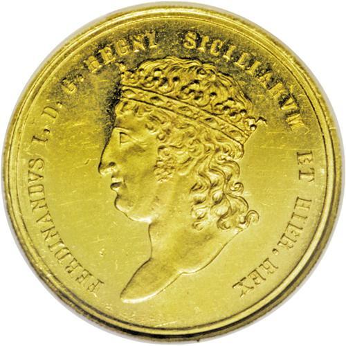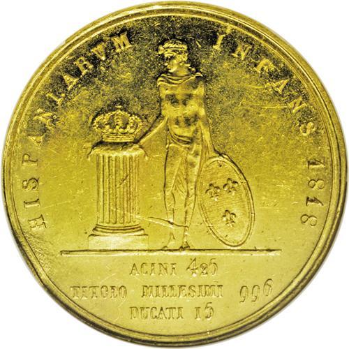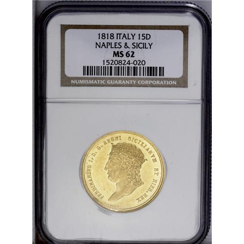 <B>Naples & Sicily. Ferdinando I gold 15 Ducati 1818,</B></I> KM-C128, F-856, MS62 NGC. Full luster with light abrasions. A very scarce one-year type.