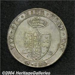 <B>Naples and Sicily.Ferdinando IV 120 Grana 1805,</B></I> Cr-99.3, F/VF with the usual light rim nicks and light adjustments. <BR><BR><B>Important notice:</B> Heritage usually auctions material at the rate of 200-250 lots per hour. On some occasions eBay Live bid software or the Internet may not be able to keep up with the pace of the auction. We recommend placing a realistic absentee bid now as insurance to avoid disappointment. Occasionally the auctioneer may eliminate or reject an eBay Live bid, and the auctioneer may also reopen a lot after the close of the eBay live bidding (usually because we missed an audience bid), and may reject your bid even if it shows you as the winning bidder. By bidding via eBay Live, you agree that Heritage may award the lot to another bidder at its sole discretion under the circumstances described above or any other reasonable circumstances. Since eBay bids are not shown to us until we open the lot on the floor, we treat those bids just like floor bids. In most cases the floor responds before the eBay bid is presented to us, due to Internet lag time, so for consistency we have made it a policy that floor bids are always considered first over tie eBay live bids. Also please note that all Heritage lots purchased through eBay Live carry a 20% Buyer's Premium. Please make sure you read the Terms and Conditions before you bid.