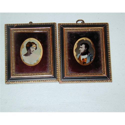 2 exqusite mini-portraits of Napolean and Empress Josephine framed and I assumed made in Germany. They look and could be tintypes. The frames are black with beaded gold trim with some knicks, scratches. They appear to be on the back of glass and each circled in art nouveau gold design with great detail in the portraits. I hve not tried to clean the glass which shows up in the picture. The hanging circle is missing from hers and the standing piece in the back is missing from his. Buyer pays shipping and handling costs.