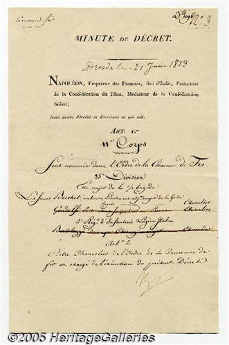 <B>Napoleon Bonapart, Document Signed as Emperor of France</B></I> Partly-printed document signed, "Np", 7.75" x 12", n.p. , June 21, 1813. A decree nominating several officers for promotion. Signed less than a year before he would abdicate and go into his first exile at Elba. Apart for some faint horizontal creases, this document is in excellent condition. <I>Accompanied by COA from PSA/DNA.</B></I>