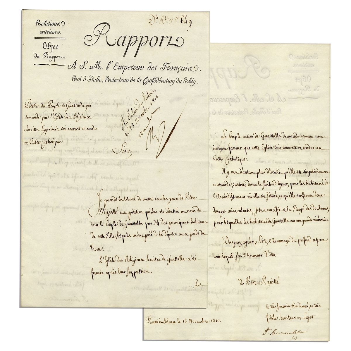 Napoleon Bonaparte document signed, dated 28 November 1810. Written in French and signed by Ferdinando Marescalchi, Italian Secretary of State, who addresses Napoleon as ''the Emperor of the French, King of Italy, Protector of the Confederation of the Rhine''. Here, Marescalchi petitions on behalf of ''the People of Guastalla'' for Napoleon to reopen the Church of Religious Servants in Guastalla, Italy, which had been closed during the French Revolution under an increased period of de-Christianization and religious suppression. Napoleon signs p.1 of document with an ''Accorde'' written in Napoleon's hand, or ''agreed'' translated into English, as he concurred with Maresalchi's request. Card-style document measures 8'' x 12.25'' and has text to front and verso of p. 1. Very minor toning, else near fine.
