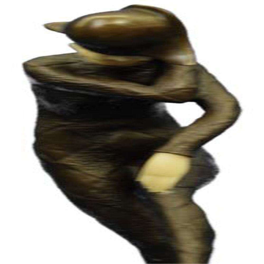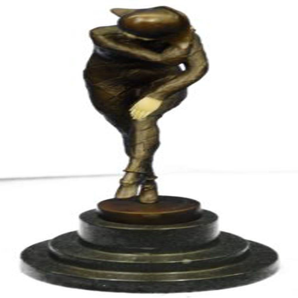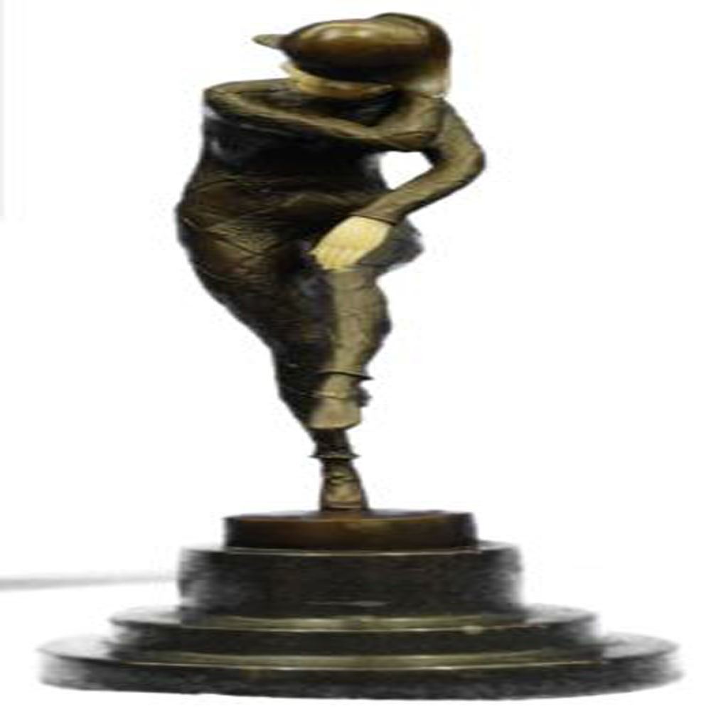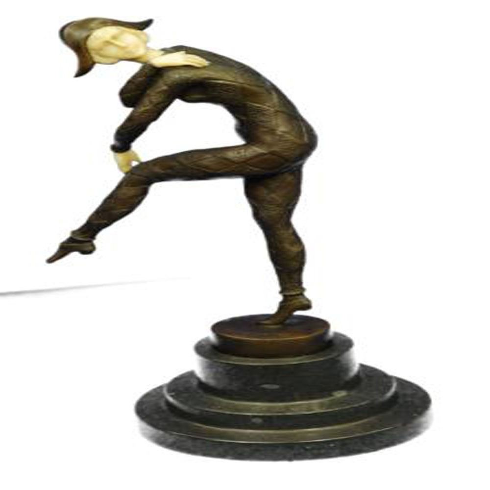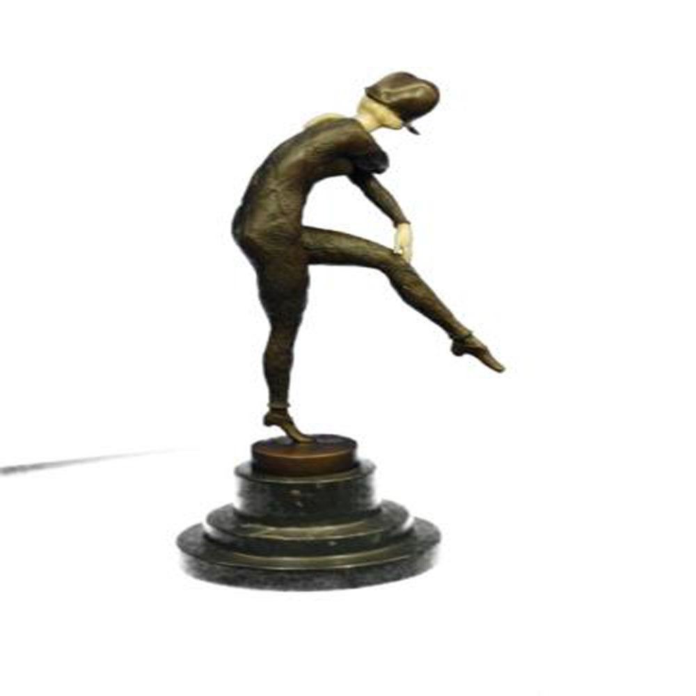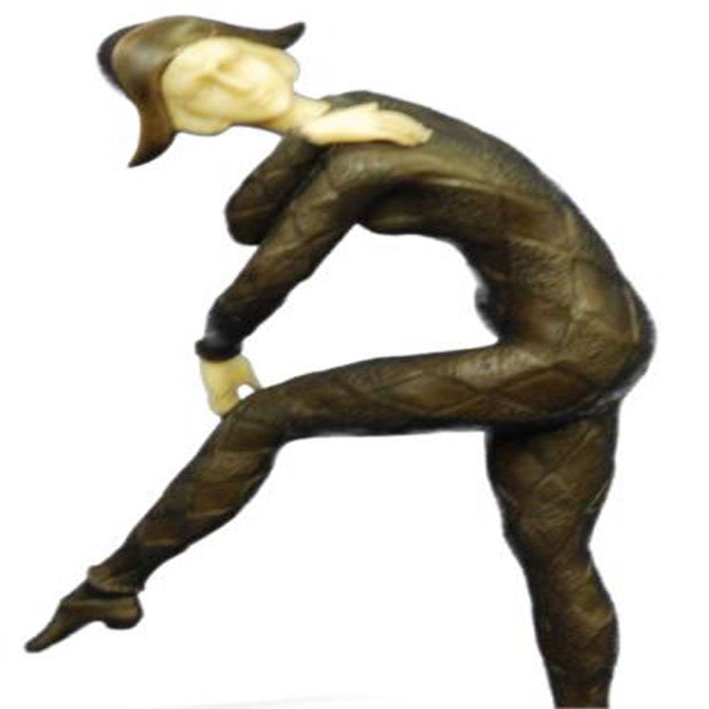 This lovely sculpture of a woman dancing across stage is astonishingly beautiful. She wears this full body one piece that is skin tight and suits her very good. She wears like a hat that looks like the shape of a pirate hat. Her body suit has unique and amazing designs all around, the shapes on her body suit are diamonds. Each pattern have a different designs, some are beads the other one are blank and the tips of the body suit have a row of beads to give it the finishing touch. She also wears little cute booties on her feet. Her position she is in, is steady and very elegant, with one hand touching her opposite shoulder. While she holds her balance on her right leg and the ball of her feet. The other leg is raised and slightly bend at the knee, while her left arm rest down touching her knee. This is an excellent piece featuring the lost wax method of casting, founded thousands of years ago ensuring an exquisitely detailed sculpture that will add grace. This piece is a must have that will surely be treasured for years to come. Bronze Dimensions with Marble Base: Height 14 X Width 7 inches. Weight: 7 LBS.