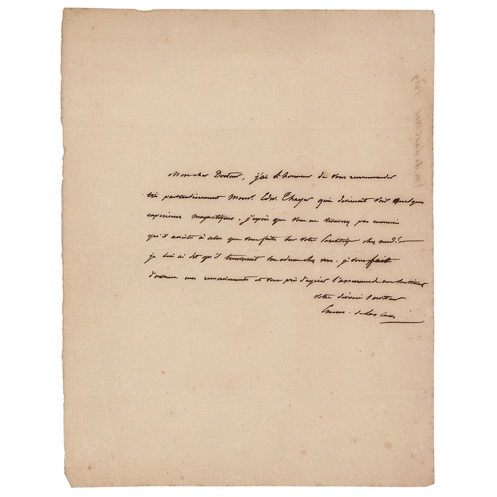 French atlas-maker and author (1766–1842) who accompanied Napoleon Bonaparte on his exile to Saint Helena, acting as his secretary there; he is famed for an admiring book about Napoleon, Le Mémorial de Sainte-Hélène ('The Memorial of Saint Helena'). ALS in French, signed “Emm. de las Cases,†one page, 7.25 x 9.5, no date. Untranslated handwritten letter by Emmanuel, comte de Las Cases. In fine condition, with light wrinkling.