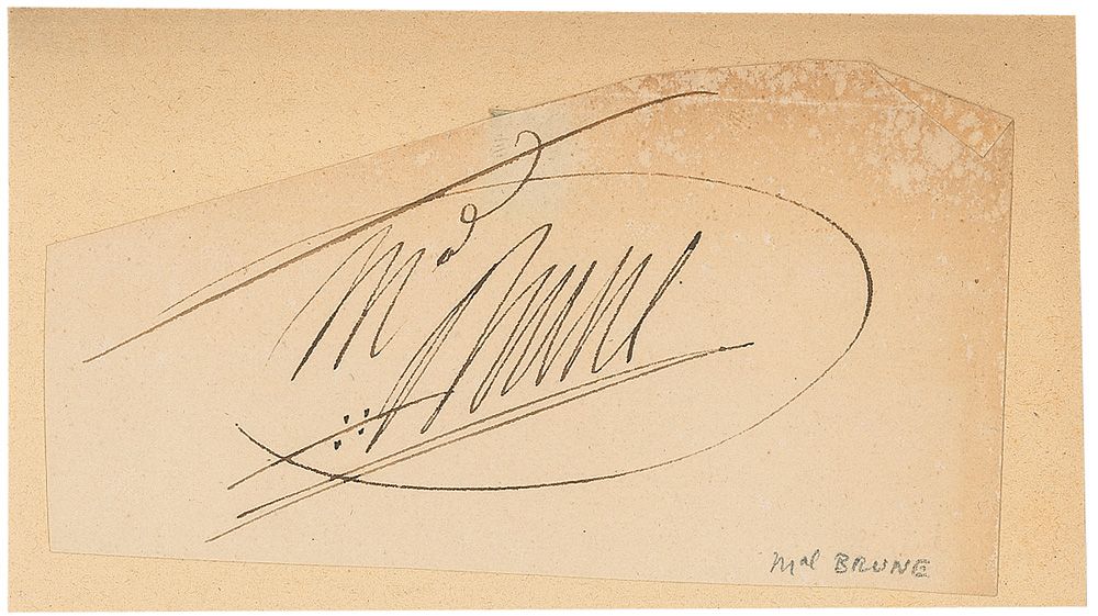 French soldier and political figure (1763–1815), he served under Napoleon Bonaparte, who named him Marshal of France in 1807. Ink signature, “Mal Brune,” on an off-white 4.5 x 2.5 clipped slip with pencil notation to lower right, and affixed to a slightly larger card. In very good condition, with toning and soiling to the right side, and an irregular top edge.