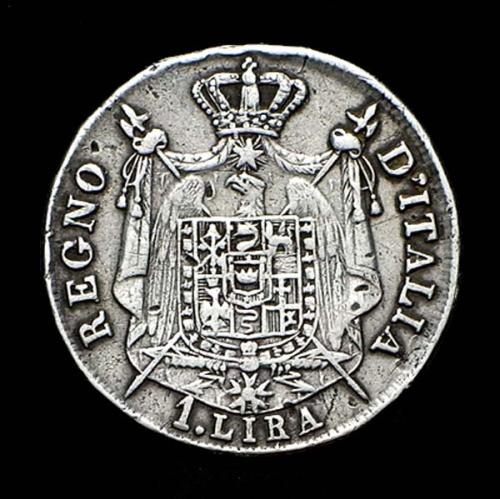 Napoleone I Re d'Italia (1805-1814) - 1 Lira 1808 Zecca: Bologna - Diritto: effigie di Napoleone a destra - Rovescio: l'aquila napoleonica regge un grande stemma entro un padiglione riccamente ornato e coronato - Variante con il segno di zecca B sovrapposto a M - Da esaminare