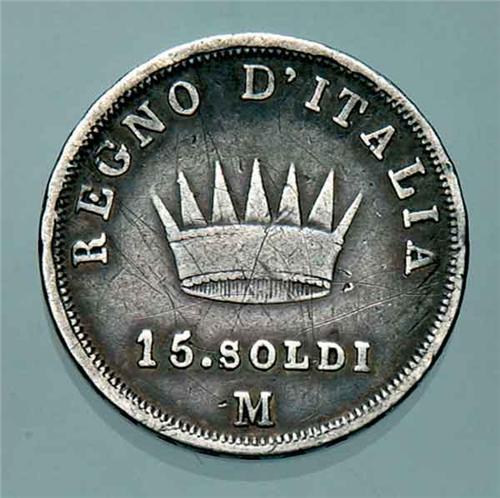 Napoleon I - 15 Soldi - 1808 - Ag - 15 Soldi 1808 Zecca: Milano - Diritto: effigie di Napoleone a destra - Rovescio: la Corona Ferrea radiata - Non comune