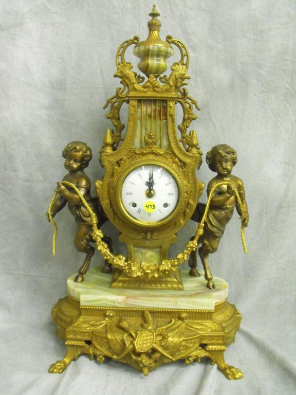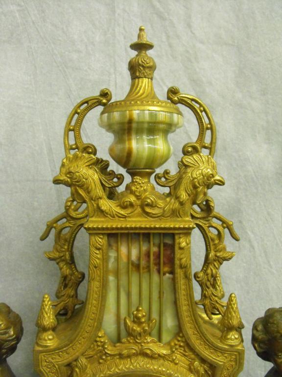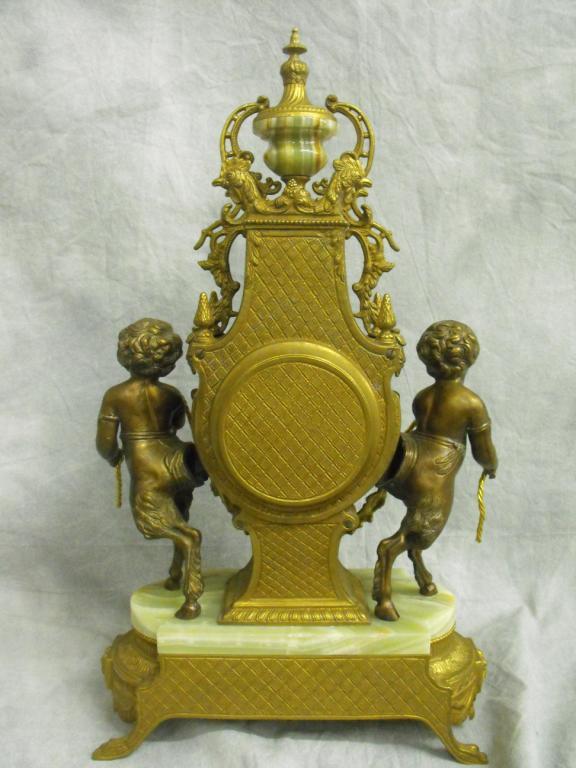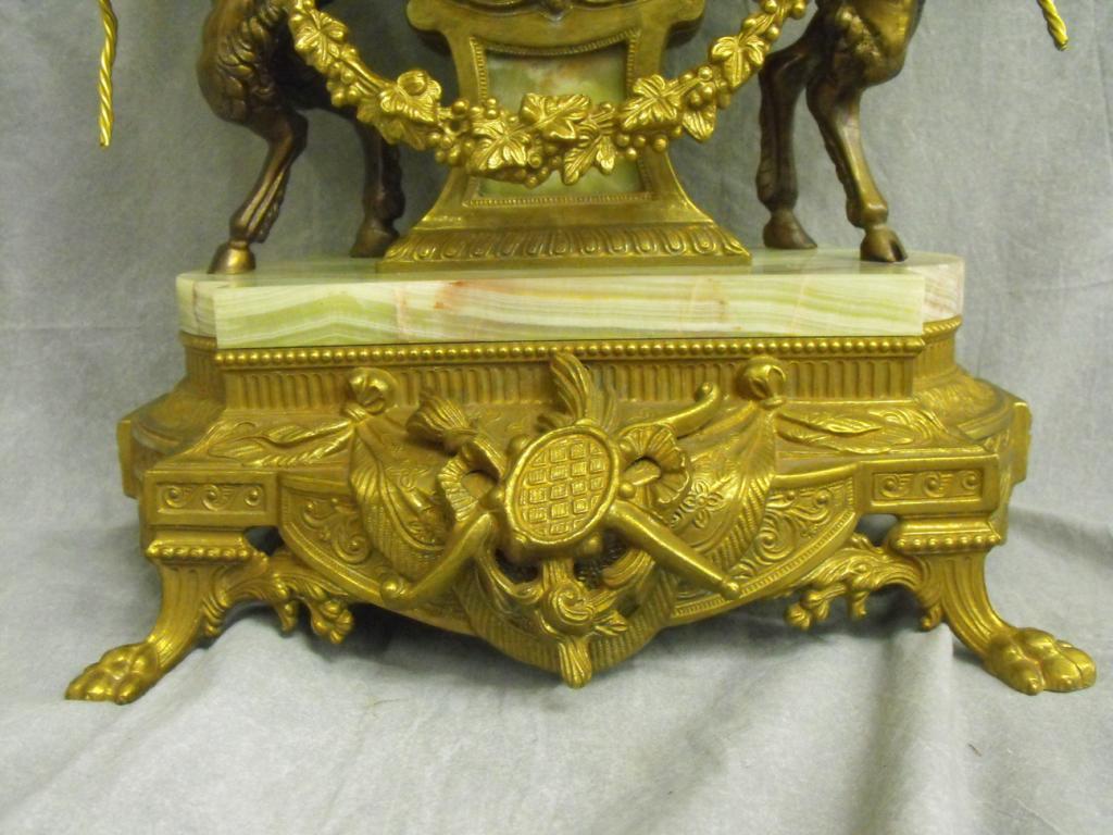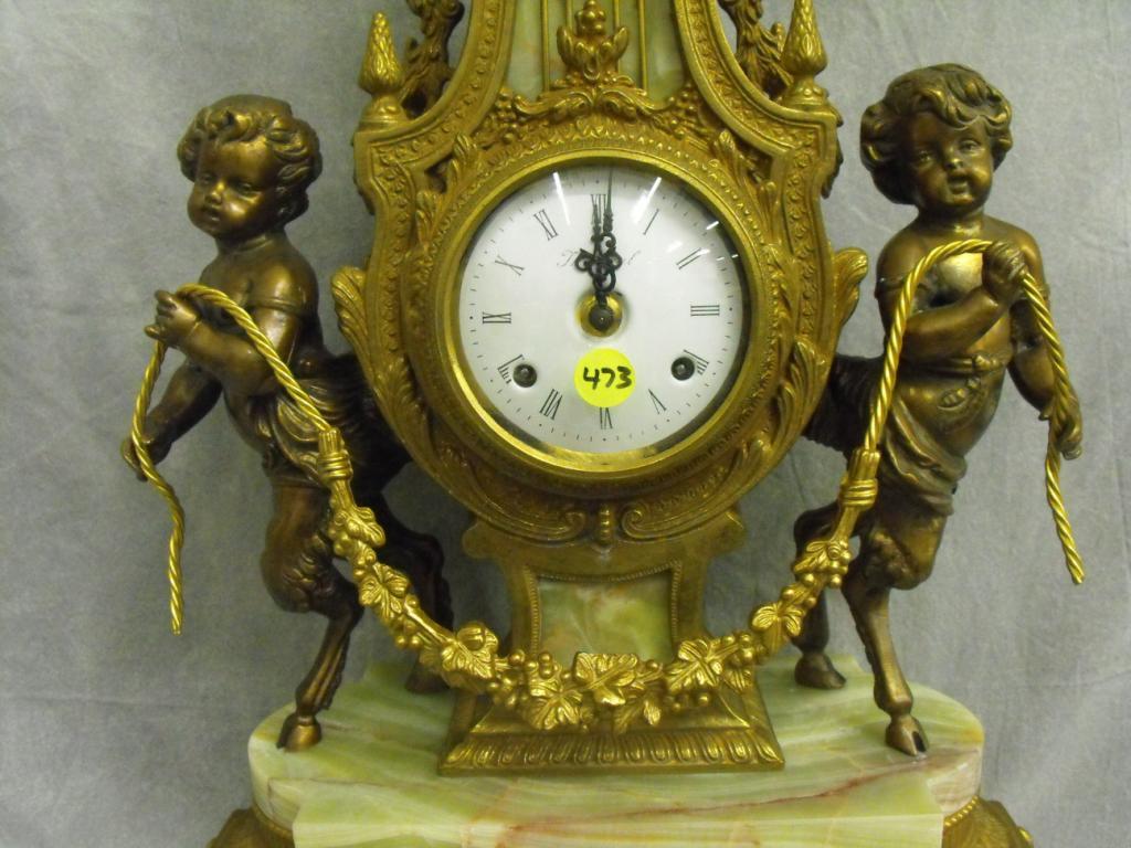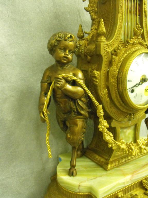 Very Ornate Napoleon II style marble and bronze mantel clock. 8 day movement with hour and half hour sounding with bim bam strike, with very nice green and red and white marble accents. White face with Roman numerals, and pair of hoofed cheriubs
