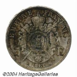 Napoleon III 5 francs 1861A, Laureate head left/Crowned and mantled arms, Gad-739, KM799.1, lightly toned, Choice Uncirculated. Very Rare and the finest example of this date that we have seen. Important notice: Heritage usually auctions material at the rate of 200-250 lots per hour. On some occasions eBay Live bid software or the Internet may not be able to keep up with the pace of the auction. We recommend placing a realistic absentee bid now as insurance to avoid disappointment. Occasionally the auctioneer may eliminate or reject an eBay Live bid, and the auctioneer may also reopen a lot after the close of the eBay live bidding (usually because we missed an audience bid), and may reject your bid even if it shows you as the winning bidder. By bidding via eBay Live, you agree that Heritage may award the lot to another bidder at its sole discretion under the circumstances described above or any other reasonable circumstances. Also please note that all Heritage lots purchased through eBay Live carry a 20% Buyer's Premium. Please make sure you read the Terms and Conditions before you bid.