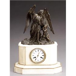 Having a two train movement striking on a bell within a white marble case surmounted by a bronze angel and child. Movement signed FARRET/ A/PARIS and with Pons Medaille d'Or medallion. Wear to patina; angel needs to be resecured; back crystal cracked; chips to marble base.