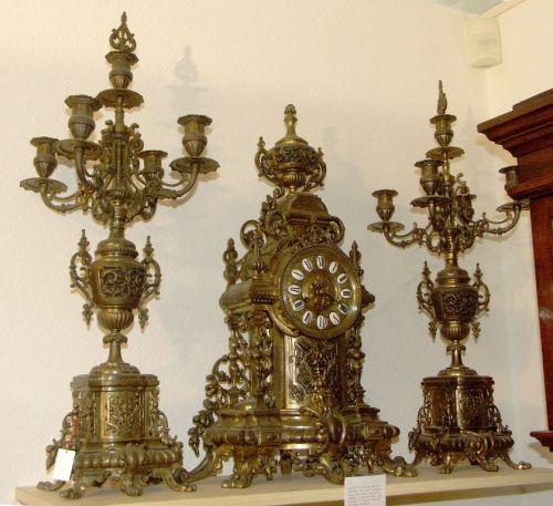 Pendule en bronze patiné Napoléon III avec candélabres, mouvement de Paris, cadran en bronze avec cartouches en émail blanc à chiffres romains, époque 1900 env.