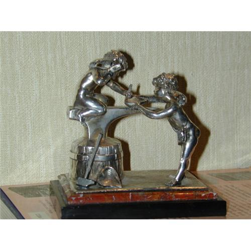 The only defect noted is that the hammer held by the angel sitting on the anvil has a slight bend.