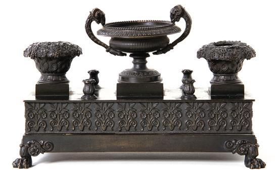 Napoleon III bronze inkstand circa 1870, rectangular stand on hairy-paw feet, surmounted with configuration of urns serving as inkpots and penholders. H7in W9 3/4in D5in Provenance: Estate of Irl Paul & Barbara Middleton, Atlanta, Georg