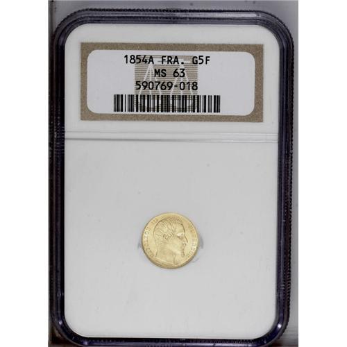 <B>Napoleon III gold 5 Francs 1854-A, </B></I>KM783, MS63 NGC, very bright mint luster, scarce in mint state.