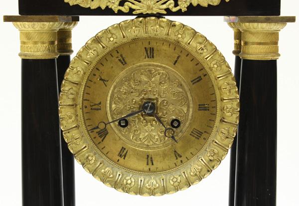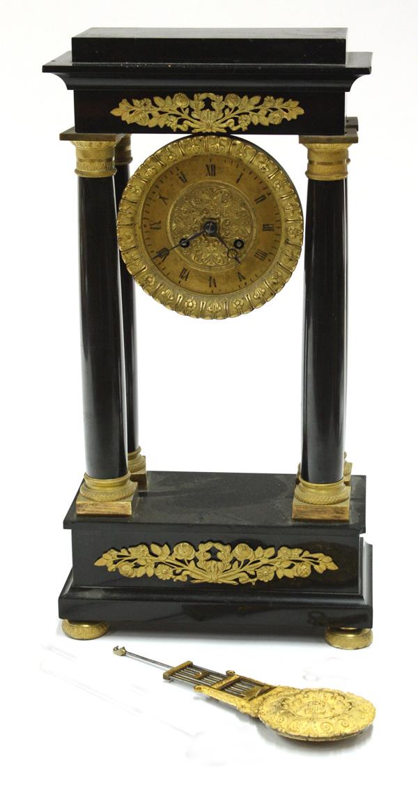 Napoleon III portico clock circa 1870, with an onyx style stone case, and an elaborate inlaid floral design, supported by four columns of the Tuscan order, raised on a plinth base, supported by four gilt adjustable bun feet, the clock with a gilt face and Roman numerals, and lyre form pendulum, ending with a brocade rosette counter weight, 18''h x 9.5''w x 5''d