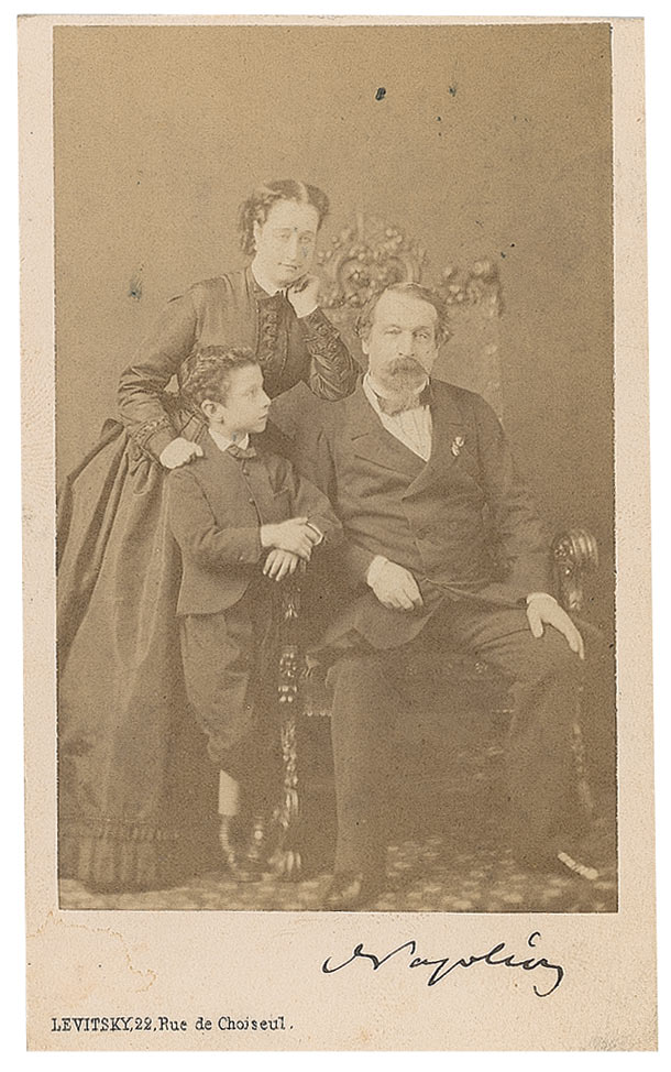 President of the French Second Republic and as Napoleon III, the ruler of the Second French Empire (1808–1873). Original sepia 2.5 x 4 carte-de-visite photo of Napoleon III, Empress Eugenie, and the Prince Imperial, by court photographer Sergei Levitsky, and so labeled along the bottom. Signed in the lower border in black ink, “Napoleon.” Pencil notation on reverse, most likely in the hand of Dr. Thomas W. Evans, reads, “Given by the Emperor before our departure for America, August 10th [18]64.” A few light dings and creases to image, as well as a bit of mild foxing to borders, otherwise fine condition.