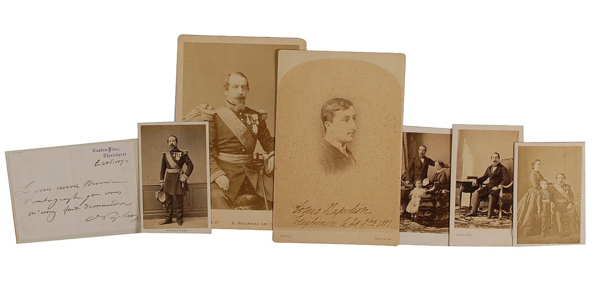 President of the French Second Republic and as Napoleon III, the ruler of the Second French Empire (1808–1873). ANS, in French, signed “Napoleon,” 4.25 x 3, January 20, 1872. In full (translated): “I send you, Sir, the autograph you requested of me.” Note is affixed to a slightly larger card; an original 4.25 x 6.5 cabinet photo of Napoleon, by R. Dichton, signed in fountain pen, “Louis Napoleon, Beighmore 21 Oct 1881.” Also included are four unsigned carte-de-visites, two of Napoleon III alone, two with Empress Eugenie and Louis Napoleon, the Prince Imperial; and an unsigned cabinet photo of Napoleon III by Ad. Braun and Cie. In very good condition, with creasing to note and scattered foxing to signed photo.