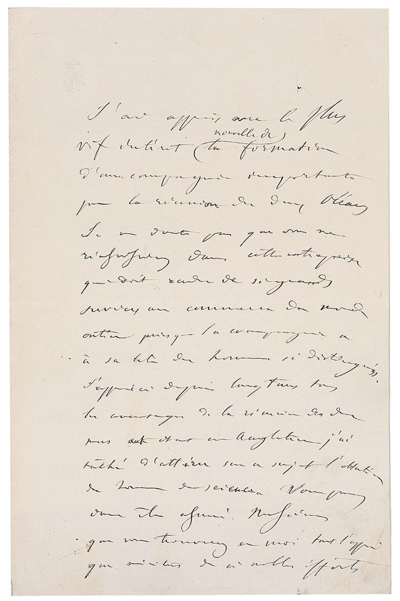 President of the French Second Republic and, the ruler of the Second French Empire (1808–1873). Partial autograph manuscript, in French, one page with his embossed initials and imperial crown, 5.25 x 8, of part of a speech given in 1853. Manuscript reads, in full (translated): “With the very greatest interest I have received the news of the formation of an important company for the uniting of the two Oceans. I have no doubt that you will succeed in this great enterprise which will render such great service to the common good of the whole world because the company is headed by such distinguished men. For some time I have been aware of all the advantages of uniting the two seas. When I was in England I tried to draw the attention of men of science to this subject. You may thus be assured, Gentlemen, that you will find in me all the support that such noble efforts deserve.” On the reverse of the second integral page, the editor of the official government newspaper Le Moniteur has written, in French, (translated): “Speech given by the Emperor to the English Depuation of the Company for the Joining of the Two Oceans. The Emperor wrote it out for me for insertion into the Moniteur. March 1853.” In fine condition, with a few light creases and thin adhesive remnant to reverse of second page. In 1846, during exile in England, Napoleon III wrote a pamphlet titled: Canal of Nicaragua: Or, A Project to Connect the Atlantic and Pacific Oceans by Means of a Canal. He embarked on a program of canal building in France and encouraged ‘men of science,’ notably Louis Pasteur to become involved.