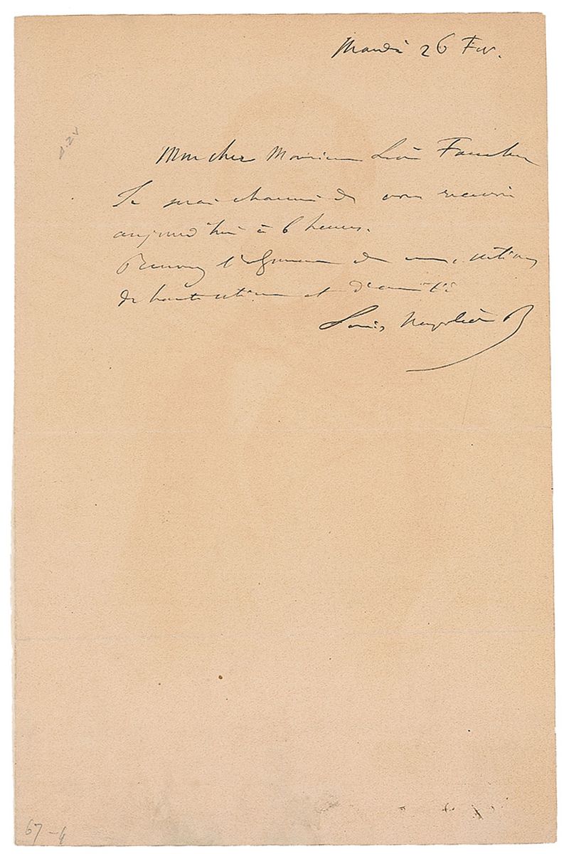 President of the French Second Republic and as Napoleon III, the ruler of the Second French Empire (1808–1873). ALS in French, signed “Louis Napoleon B,” one page, 5.25 x 8, February 26 [1851], as President of the French Republic. Letter to Leon Faucher, his then-Minister of Public Works who would become his Prime Minister just two months later. In fine condition, with scattered mild creasing and toning. A letter from a momentous time in French history, months before the coup d’etat of December 1851, when Bonaparte proclaimed himself Emperor and Faucher resigned.