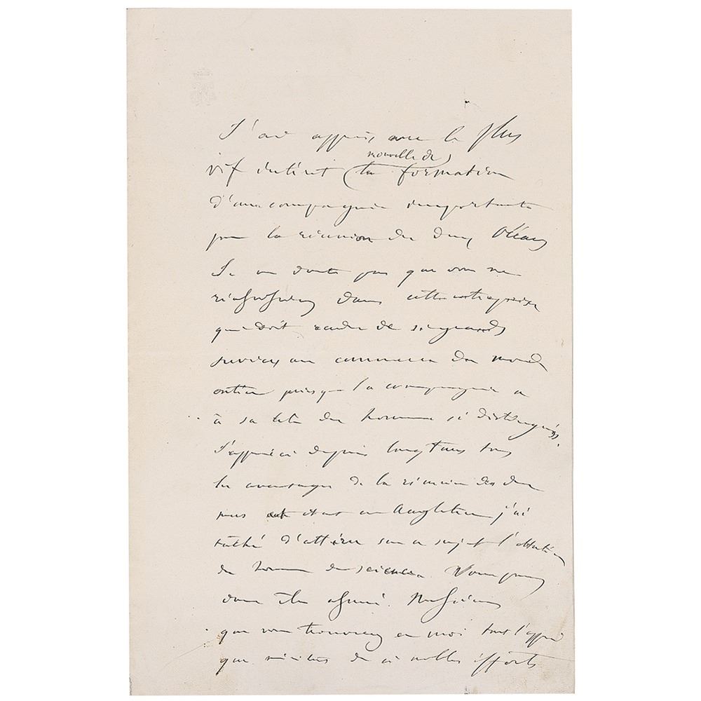 President of the French Second Republic and, the ruler of the Second French Empire (1808-1873). Partial autograph manuscript, in French, one page with his embossed initials and imperial crown, 5.25 x 8, of part of a speech given in 1853. Manuscript reads, in full (translated): "With the very greatest interest I have received the news of the formation of an important company for the uniting of the two Oceans. I have no doubt that you will succeed in this great enterprise which will render such great service to the common good of the whole world because the company is headed by such distinguished men. For some time I have been aware of all the advantages of uniting the two seas. When I was in England I tried to draw the attention of men of science to this subject. You may thus be assured, Gentlemen, that you will find in me all the support that such noble efforts deserve." On the reverse of the second integral page, the editor of the official government newspaper Le Moniteur has written, in French, (translated): "Speech given by the Emperor to the English Depuation of the Company for the Joining of the Two Oceans. The Emperor wrote it out for me for insertion into the Moniteur. March 1853." In fine condition, with a few light creases and thin adhesive remnant to reverse of second page. In 1846, during exile in England, Napoleon III wrote a pamphlet titled: Canal of Nicaragua: Or, A Project to Connect the Atlantic and Pacific Oceans by Means of a Canal. He embarked on a program of canal building in France and encouraged 'men of science,' notably Louis Pasteur to become involved.