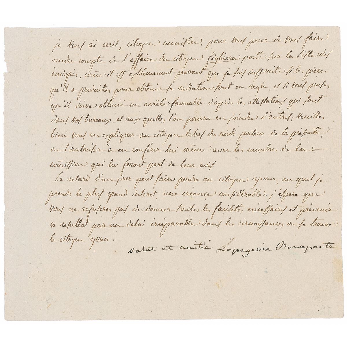 LS in French, signed “Lapagerie Bonaparte,” one page, 7.5 x 6.5, no date. In part (translated): “I have written to you, Minister, to ask you to do everything possible to resolve the question of citizen Figliera, who has been included in the list of the émigrés. It is extremely pressing that I learn if the document that he has shown to obtain his exit from the list is regular. It is important that he obtains a favorable decision, based on the attestations that have been in your office and to which others can be joined...The delay of just one day may cause a great loss to citizen Yvan, on whom I have the greatest interest, and he will lose a considerable sum. I hope you will not refuse to give me all the facilities necessary and to avoid the terrible results that a delay would cause and the circumstances which citizen Yvan is in now.” In fine condition, with a few pinholes to lower left and a couple trivial chips and stains to edges. The “list of émigrés” referred to in this letter held the names of noblemen who had fled France during the Revolution. From afar, many plotted against the Revolutionary government and attempted to build foreign support for their cause. In response, the government took severe actions against them: any émigré who did not return by 1792 would lose his property to the state, and would also find himself liable to death as a traitor. According to the Josephine, citizen Figliera was wrongly added to this list. An excellent letter, attempting to safeguard the funds and property of a citizen for whom she held “the greatest interest.”