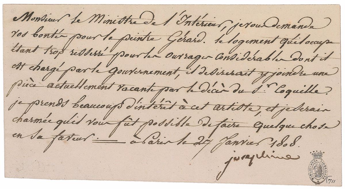 First wife of Napoleon and thus the first empress of the French (1763–1814). Manuscript LS in French, signed “Josephine,” one page, 7.25 x 3.75, January 27, 1808. Letter to the Minister of the Interior asking for his “goodness towards the painter Gerard. His present lodgings are too small for the large canvas the government has commissioned him to paint, and he would like to add the room left vacant by the death of Mr. Coquille. I take a great interest in this artist and I will be delighted if anything can be done in his favor.” Letter also bears the stamp of the famous ‘Lindesiana’ Napoleonic collection formed by Lord Crawford in the 19th century. In fine condition. At the height of his popularity as a portrait artist—due in large part to his 1805 sitting with Napoleon, which resulted in the Emperor’s favorite likeness of himself—Francois Gerard strove to elevate his career into historical painting. His greatest achievement, and likely the “large canvas the government has commissioned him to paint” referred to in this letter, was his magnificent portrayal of Napoleon’s decisive victory at the Battle of Austerlitz. Unveiled at the Salon of 1810, it quickly became one of the most celebrated representations of Napoleon’s reign. A scarce and desirable letter from the first French empress, showing her support for one of the foremost artists of the empire.