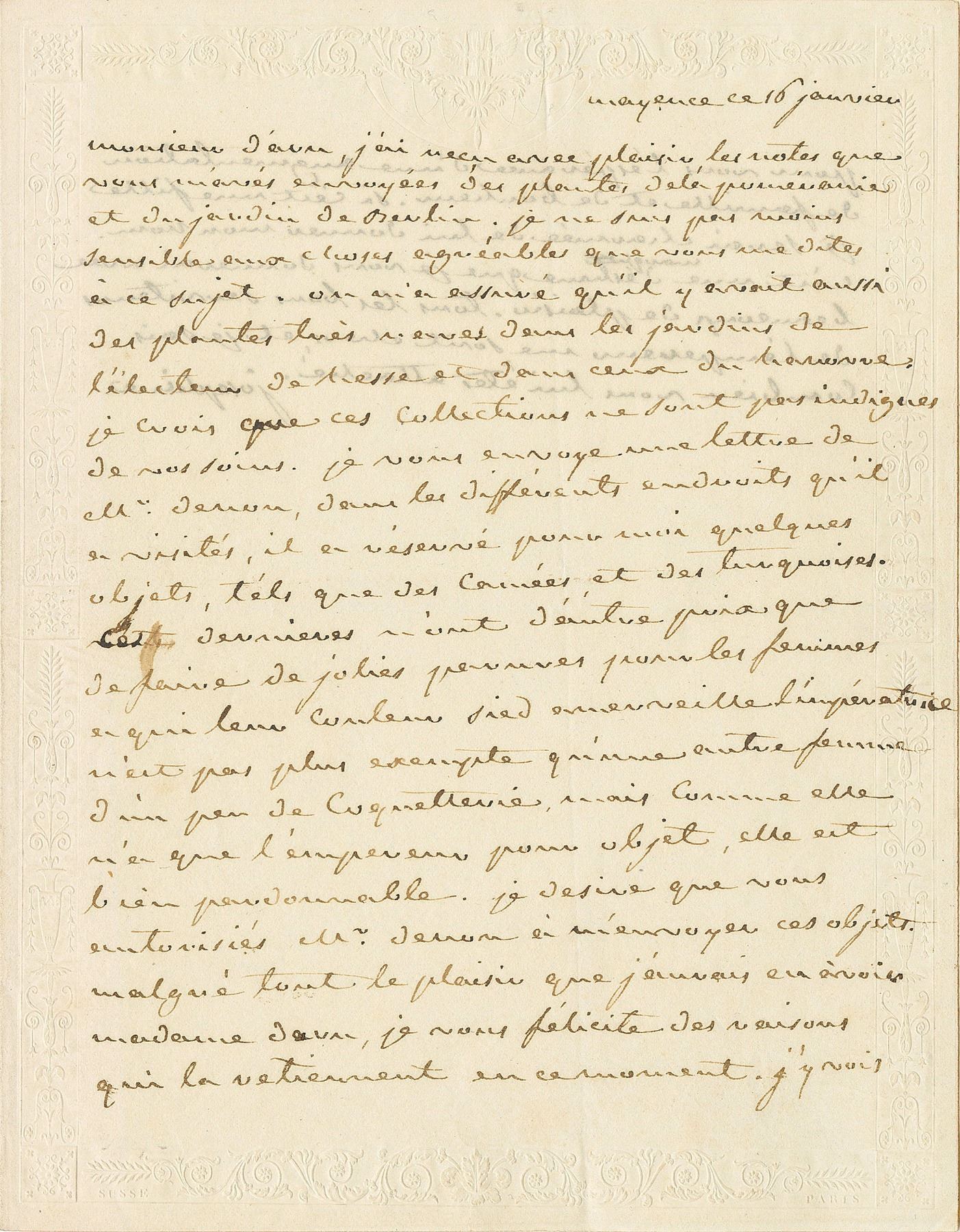First wife of Napoleon and thus the first empress of the French (1763–1814). ALS in French, signed “Josephine,” one page, 6 x 7.75, January 16, 1807. Letter to Martial Noel Pierre Daru, written on paper with an attractive decorative embossed border. In part (translated): "I have received with pleasure the notes you sent me about the plants of Pomerania and the Berlin Garden…I have been assured that there were also very rare plants in the gardens of the Elector of Hesse and in those of Hanover. I think these collections are not unworthy of our attention…Mr. Denon…reserved some things for me, such as cameos and turquoises. These latter have no value except to be made into ornaments for pretty ladies, to whom their color is wonderfully becoming. The Empress is no more devoid of a little coquetry than any other woman, but as the Emperor is her only object, she may well be pardoned." In fine condition. Accompanied by a complete French transcription and English translation. Josephine was a passionate amateur botanist, and famously developed exotic gardens on the grounds of the Chateau de Malmaison outside Paris; the property achieved enduring fame for its unsurpassed rose gardens. Josephine is rare in autograph letters, and this example boasts especially desirable content.